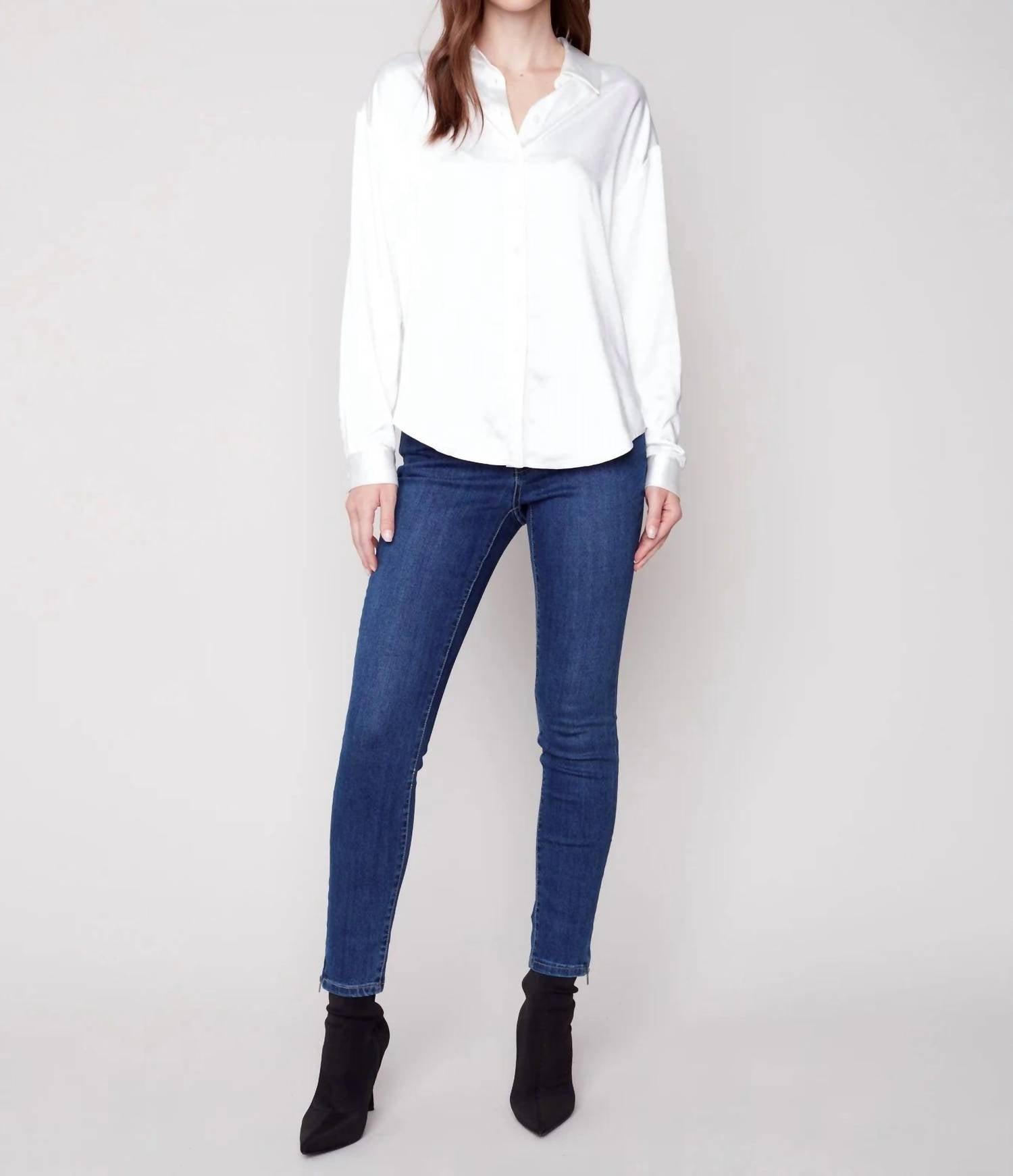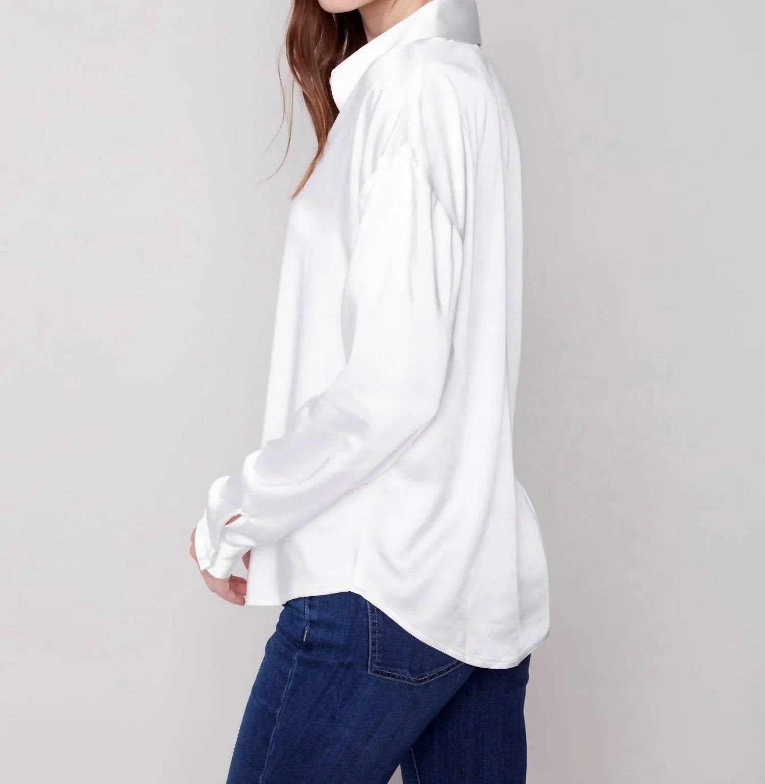 Побалуйте себя элегантностью с атласной рубашкой Harper от Charlie B, изысканным дополнением к вашему гардеробу. Эта блузка с длинными рукавами однотонного белого цвета идеально сочетает в себе непринужденный и изысканный стиль. Изготовленная из 100% полиэстера, она имеет классическую застежку на пуговицы и воротник-стойку. Уход: ручная стирка в холодной воде и сушка на веревке, чтобы сохранить блеск.