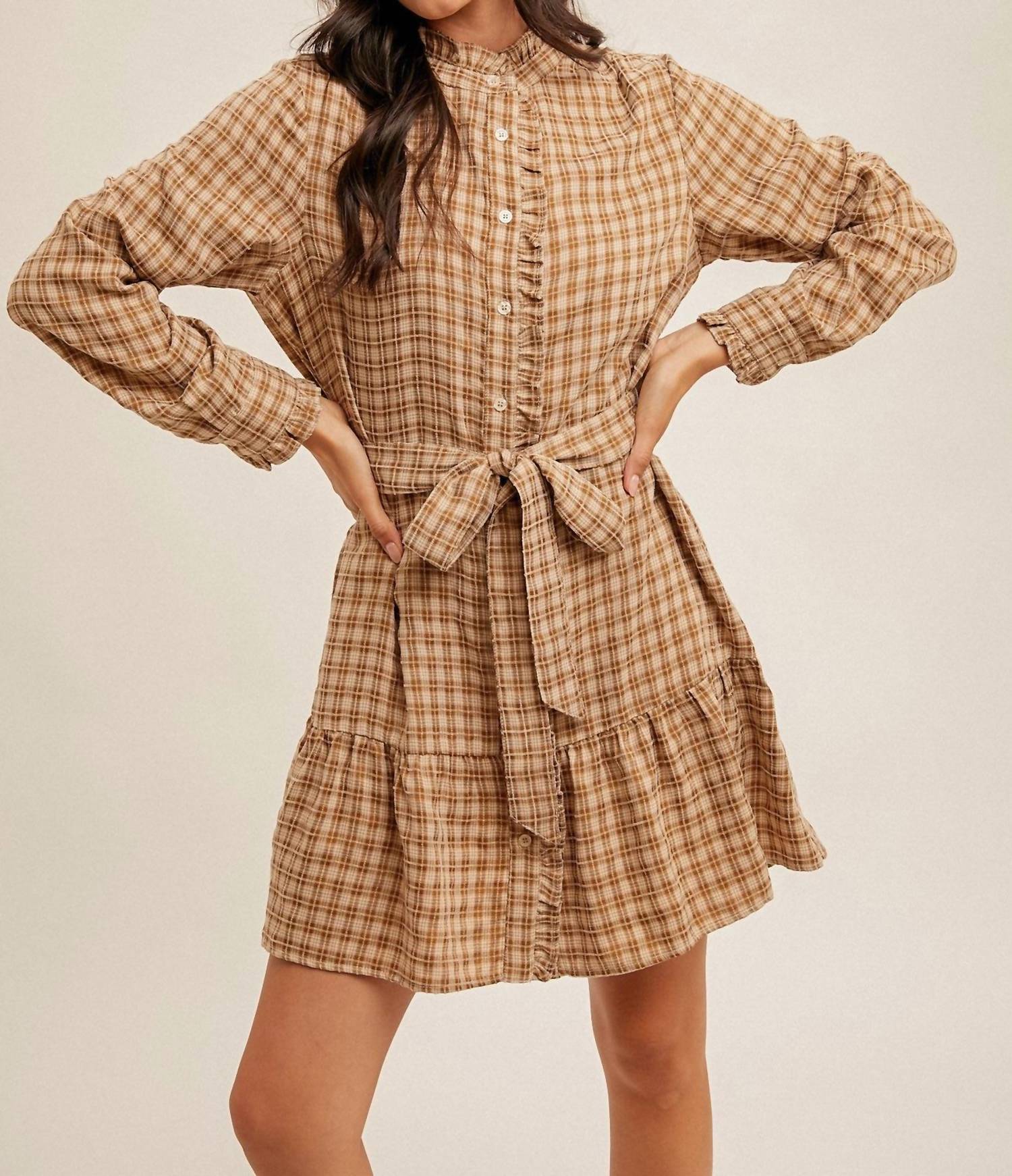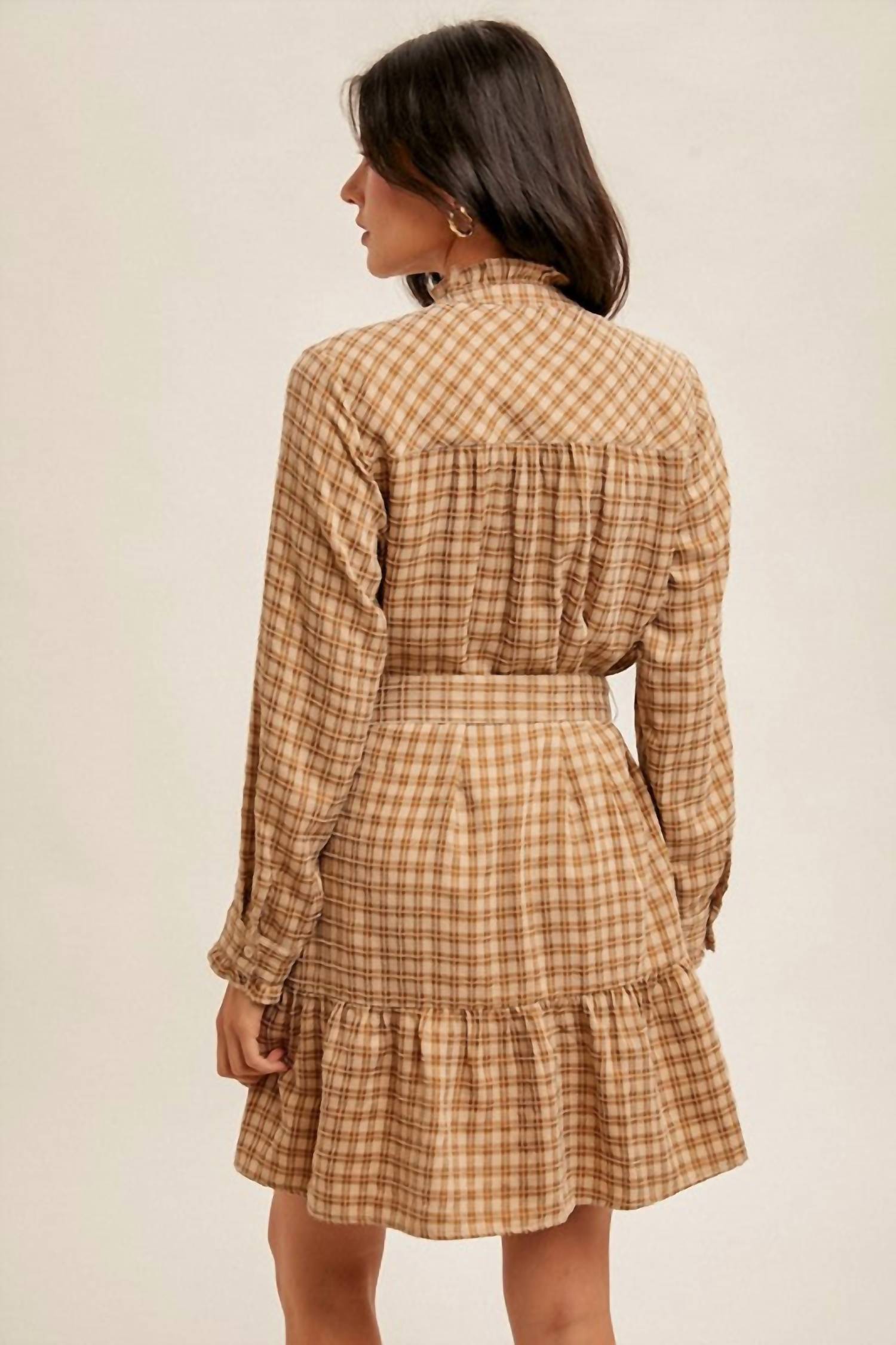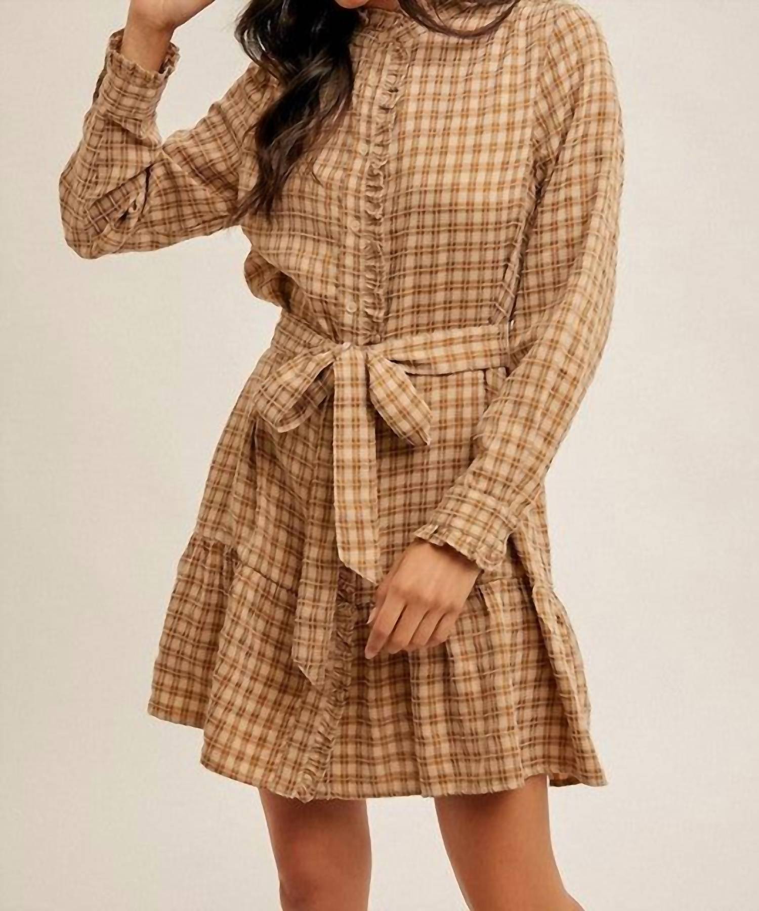 Идеальное мини-платье для теплых месяцев. Представляем платье-рубашку Hem ; Thread Plaid Belted Ruffle Shirt Dress - шикарное мини-платье, которое идеально подходит для демонстрации вашей игривой натуры. Это платье с длинными рукавами, выполненное из смеси 50% полиэстера и 50% вискозы, отличается очаровательным клетчатым узором, стильным поясом на талии и игривыми оборками. Круглый вырез горловины дополняет рубашечный силуэт, а застежка на пуговицы добавляет практичности и стиля. Это платье идеально подходит для самых разных случаев и приглашает к веселым и модным моментам.