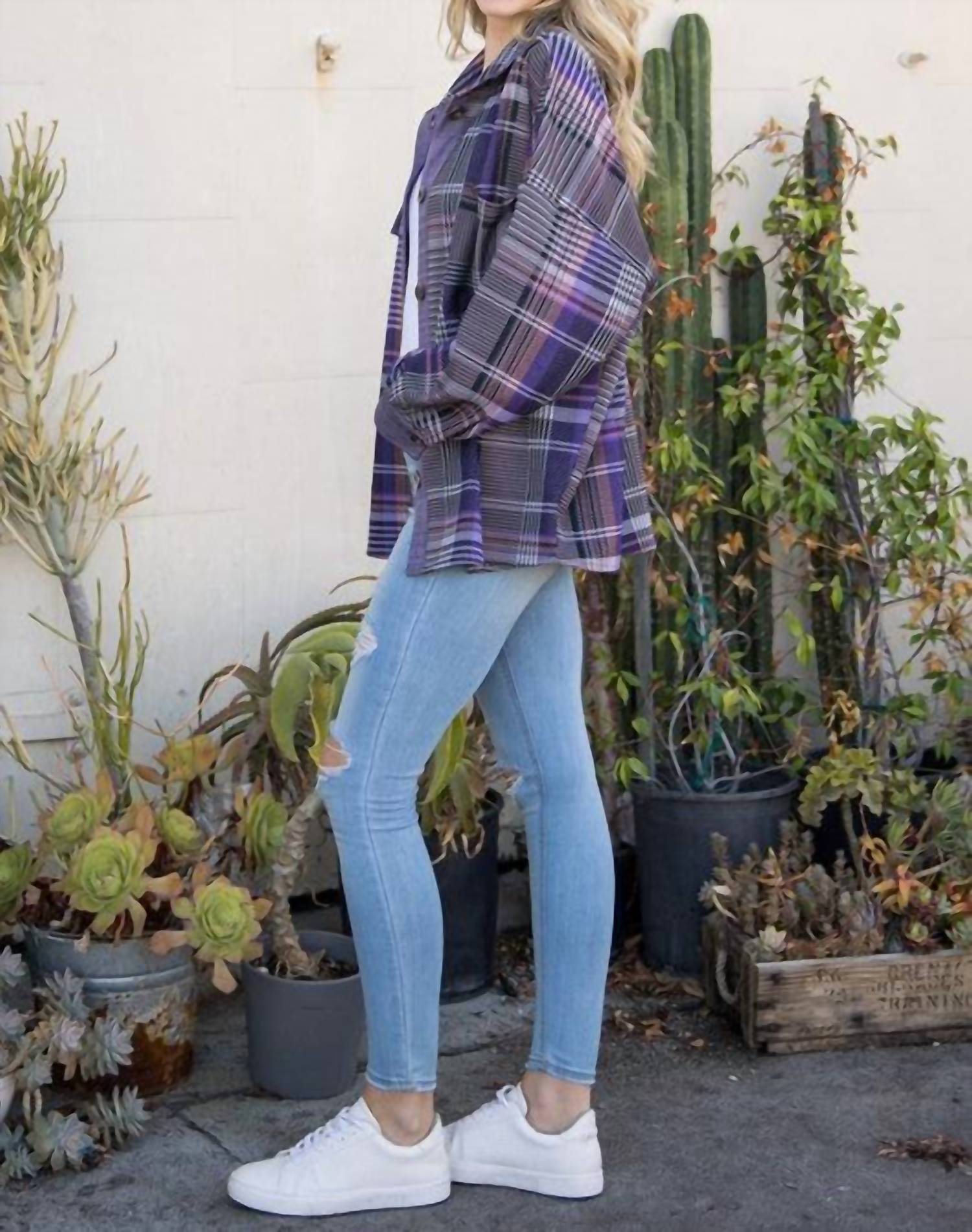 Повседневная, но стильная куртка, которая должна быть в каждом гардеробе. Дополните свой гардероб клетчатой курткой Ellis Plaid Shacket с ярким фиолетовым клетчатым узором. Эта куртка с длинными рукавами изготовлена из мягкой смеси 80% полиэстера и 20% вискозы, обеспечивая свободный силуэт, идеально подходящий для многослойной одежды. Эта куртка длиной 29 дюймов из США с удобной застежкой на пуговицы и функциональными карманами практична и стильна. Идеально подходит для создания универсального повседневного образа, сочетающего комфорт и современный стиль.