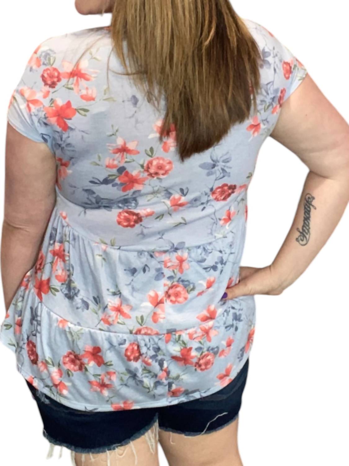 Цветочный принт. Короткий рукав. Круглый вырез горловины. Модель легко надевается. Состав: 65% полиэстер, 35% вискоза. Импортный.