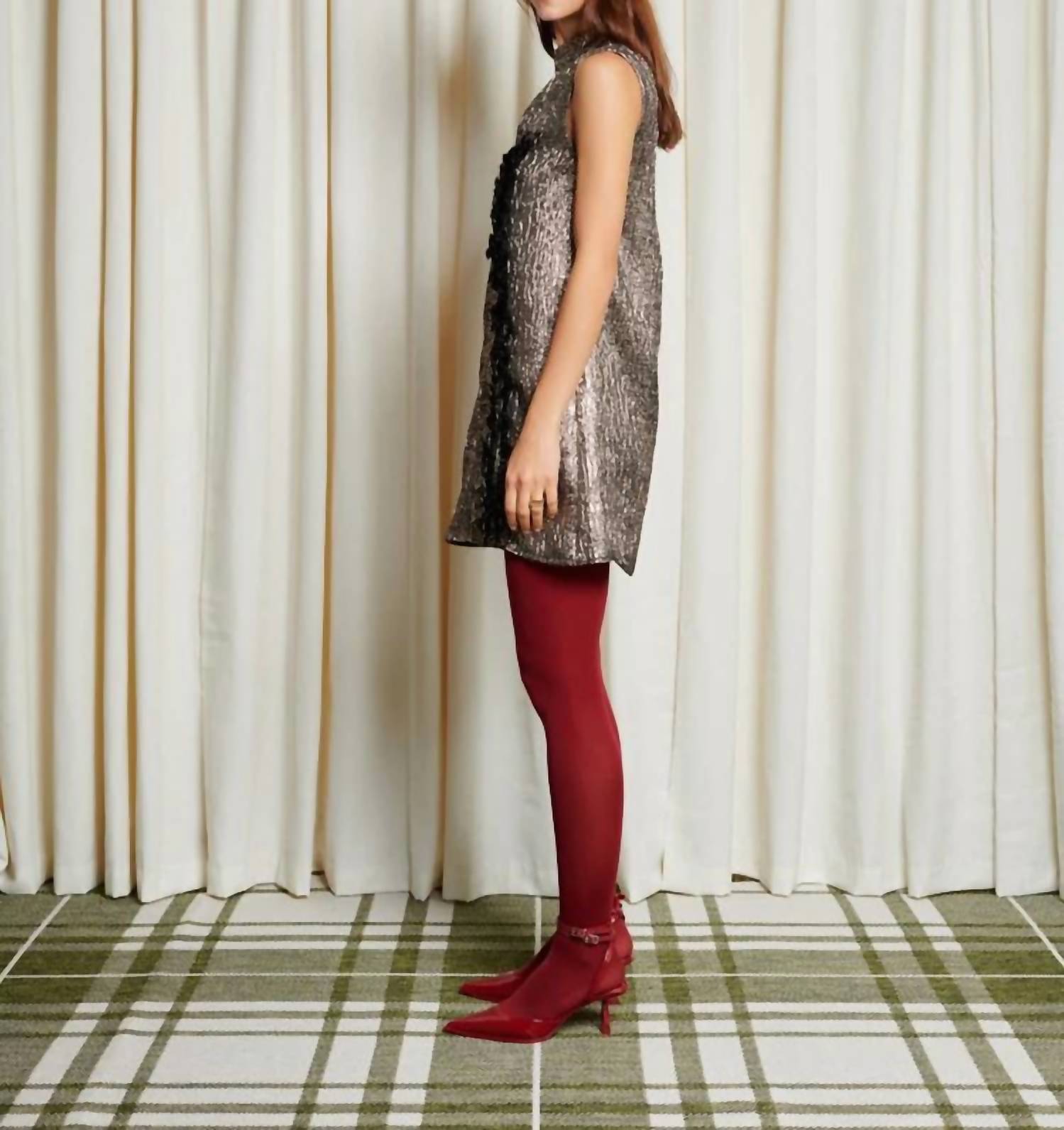 Эффектное платье без рукавов из 100% полиэстера с металлизированным жаккардом. А-силуэт с вертикальными косыми оборками и необработанной отделкой создает эффектный, фактурный образ. Изящный ложный вырез горловины. Удобная застежка-молния сзади. Длина 88 см. Мини-платье полностью на подкладке обещает ослепительное сияние бронзового цвета.