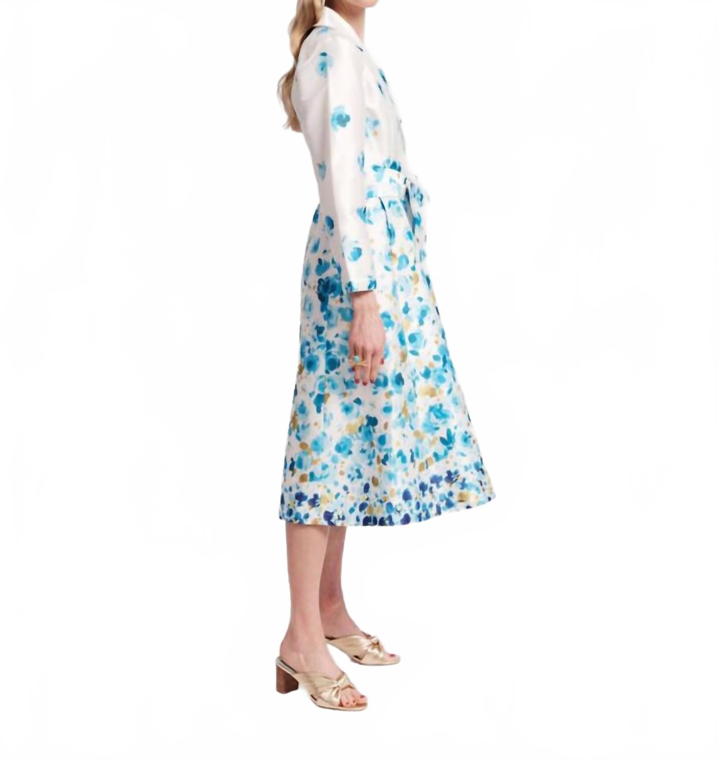 Платье идеальной длины существует. Представляем платье-халат Lucille от Frances Valentine - изысканный выбор для любого званого ужина. Это синее платье миди с узором, украшенное карманами и букетами, имеет V-образный вырез, элегантные рукава три четверти и воротник с острыми лацканами. Платье, искусно изготовленное в Индии из роскошного полидупиони, имеет вытачки для идеального кроя и регулируемый пояс для идеальной посадки. Платье имеет два кармана и потайную завязку для безупречного кроя. Для ухода за ним требуется профессиональная химчистка.