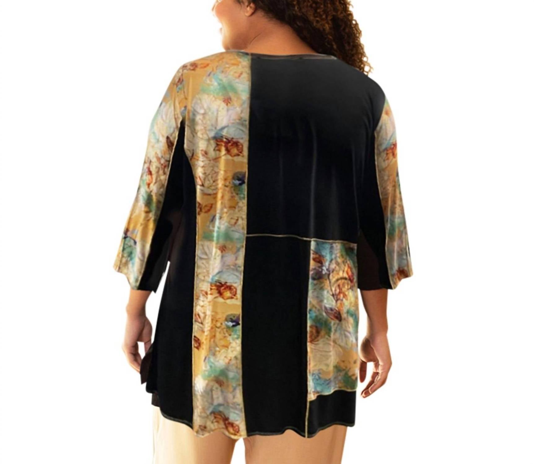 Рукава 3/4. Закругленный подол. Стирать в холодной воде на деликатном режиме, гладить с изнаночной стороны под тканью, не подвергать химчистке.