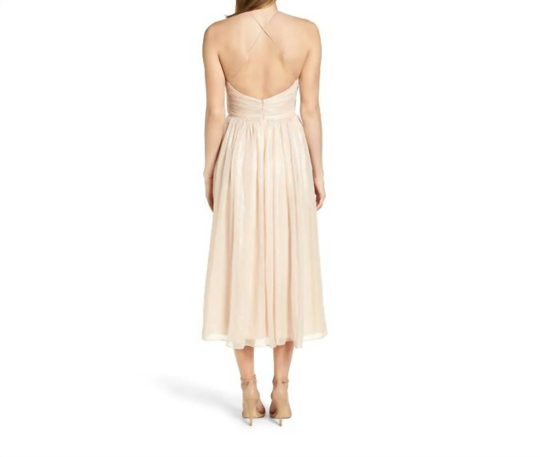 Платье идеальной длины существует. Представляем плиссированное платье миди цвета шампанского с мерцающим лифом от Vera Wang - потрясающий бежевый шедевр, идеально подходящий для коктейльных мероприятий. Это платье с бретельками-спагетти и облегающим силуэтом «клеш» элегантно подчеркивает лиф очаровательными сборками и мерцающими деталями. Платье изготовлено из роскошной смеси 65% полиэстера и 35% хлопка. Длина платья - 128 см, обхват груди - 45,5 см, обхват талии - 33 см. Это платье на подкладке с удобной застежкой-молнией сзади - незаменимая вещь для тех, кто хочет создать изысканный образ. Уход: локальная чистка.