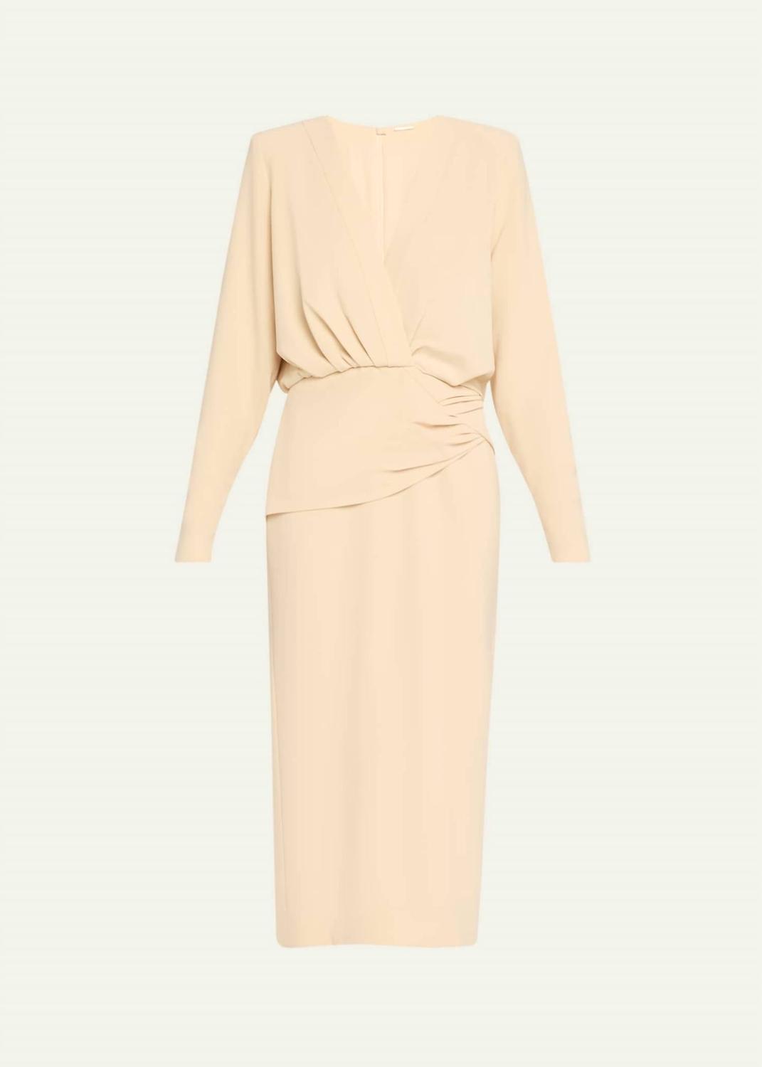 Представляем платье миди Fraser от ALEXIS - изысканный выбор элегантного кремового цвета. Платье с длинными рукавами выполнено из полиэстера с эластаном для комфортной посадки. Платье имеет силуэт с запахом и V-образным вырезом, длиной ниже колена и потайной молнией сзади для бесшовного ношения. Платье импортного производства, на подкладке из полиэстера. Для оптимального ухода необходима химчистка.