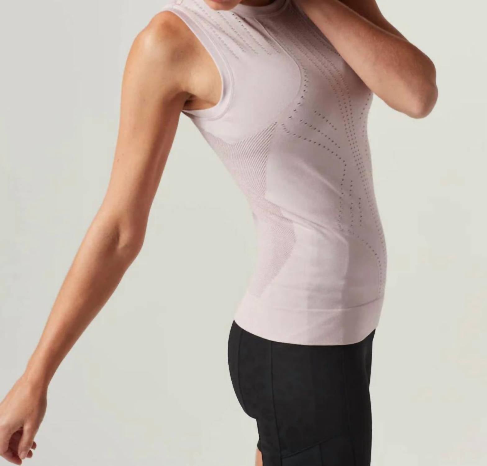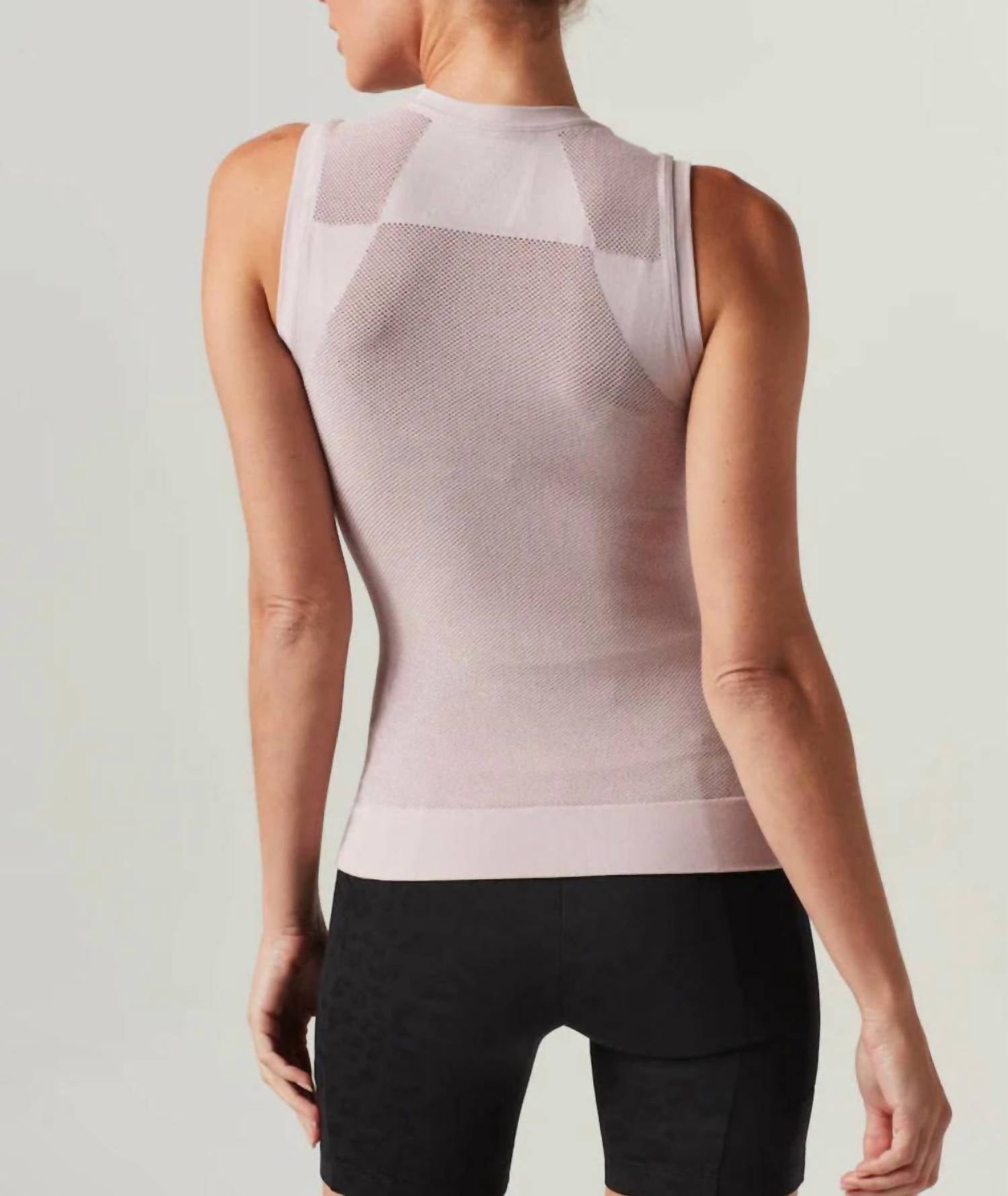 Бесшовная текстура, облегающая фигуру, с сетчатой ​​вентиляцией. Состав: 82% вискоза, 13% полиамид, 5% эластан. На модели размер Small.