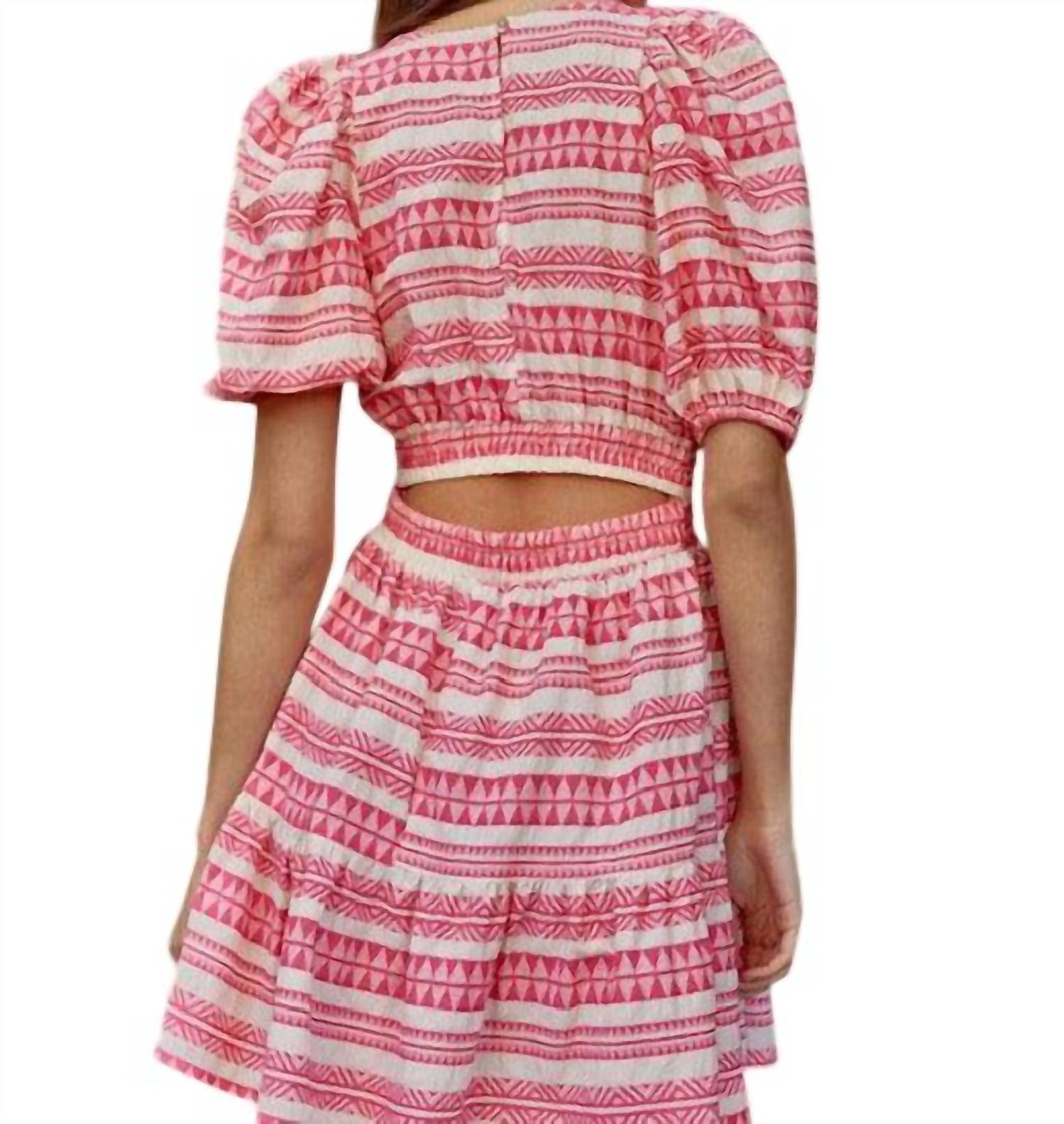 Идеальное мини-платье для теплых месяцев. Представляем платье Cutout Dress от Self Contrast - стильную модель с шикарным розово-белым фактурным принтом. Это мини-платье с короткими рукавами-фонариками и А-силуэтом, дополненным женственным круглым вырезом. Эластичный пояс обеспечивает комфорт, а вырез на спине добавляет игривости. Застежка - пуговицы, идеально подходящая для непринужденного образа.
