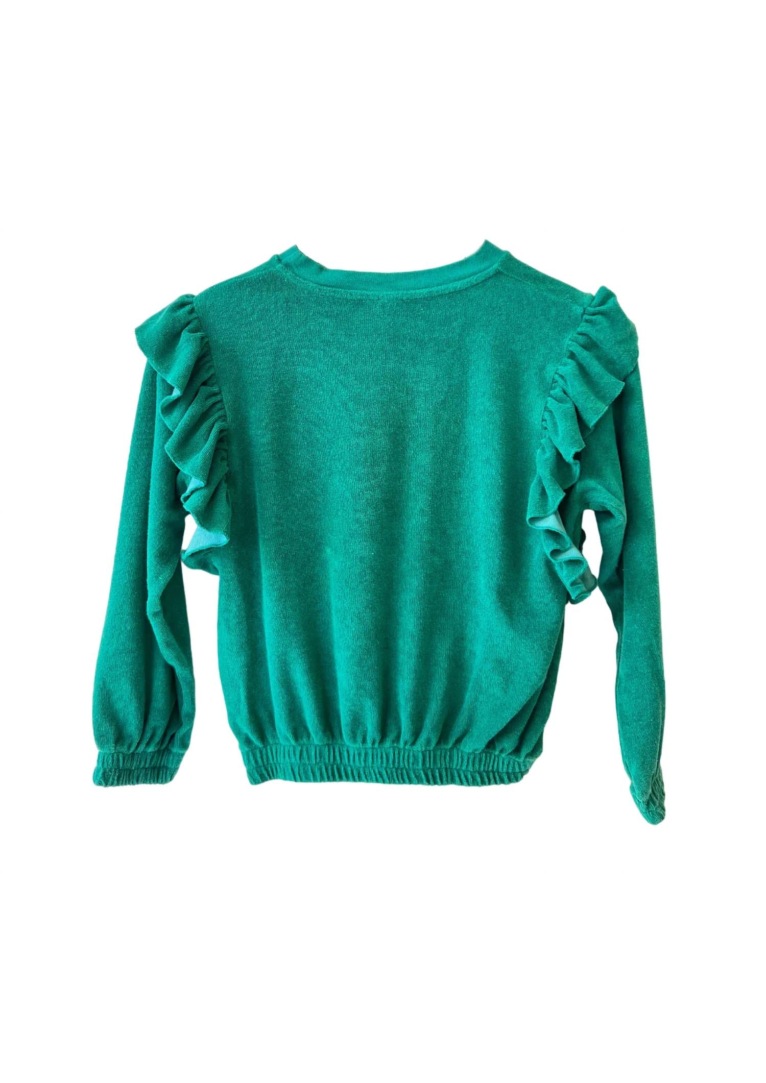 Очаровательная нашивка со смайликом и уникальная оборка на плече. Круглый вырез горловины. Длинные рукава. Джемпер. Изготовлен из мягкой махровой ткани.
