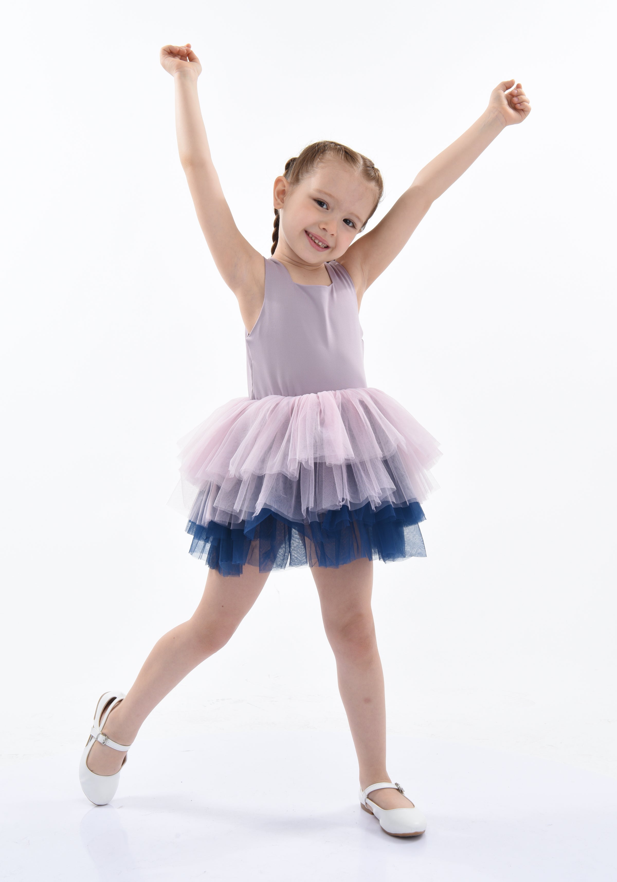 Фиолетовое платье-туту Mia Tutu для девочек от Mimi Tutu. Тонкие рукава, квадратный вырез и несколько слоев легкого пышного тюля с темно-синей подкладкой из тюля.