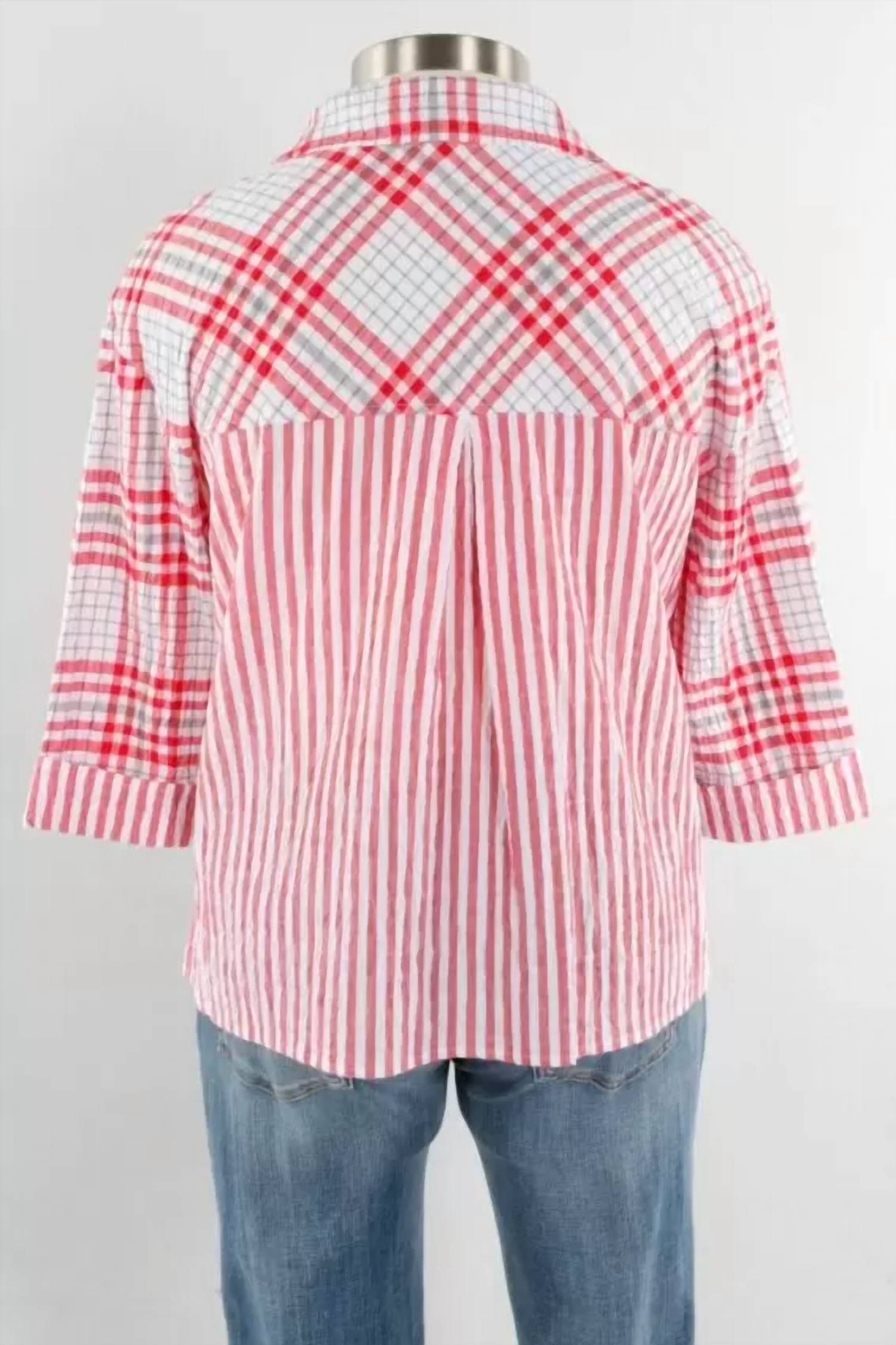 Стильная вещь в ярком томатном цвете. Этот хлопковый топ украшен искусно комбинированной клеткой и полосками из сирсакера. Длинные рукава с манжетами и заостренный воротник придают ему особый шарм. Состав: 99% хлопок, 1% спандекс. Оригинальная застежка на пуговицы. Машинная стирка в холодной воде, сушка в стиральной машине при низкой температуре.