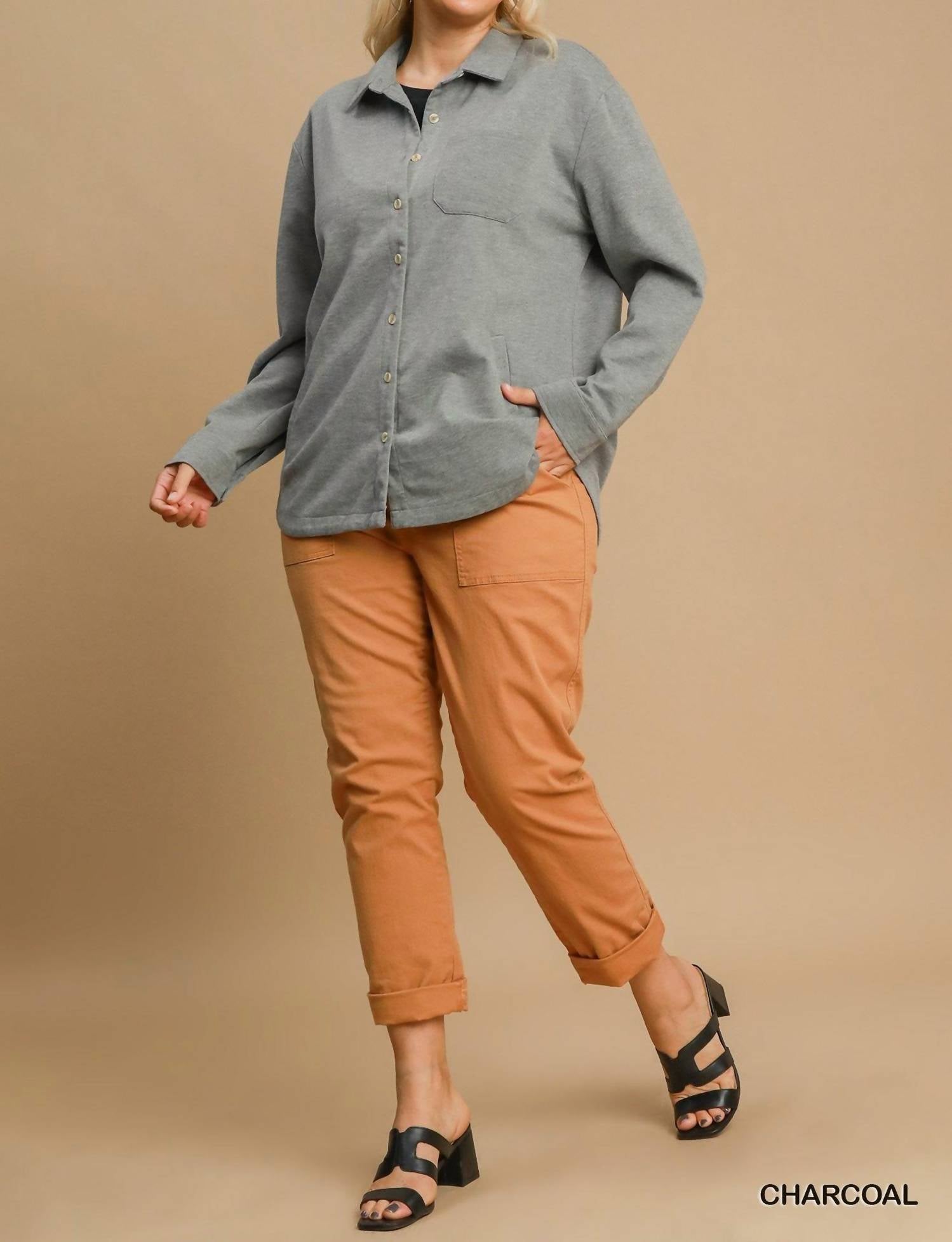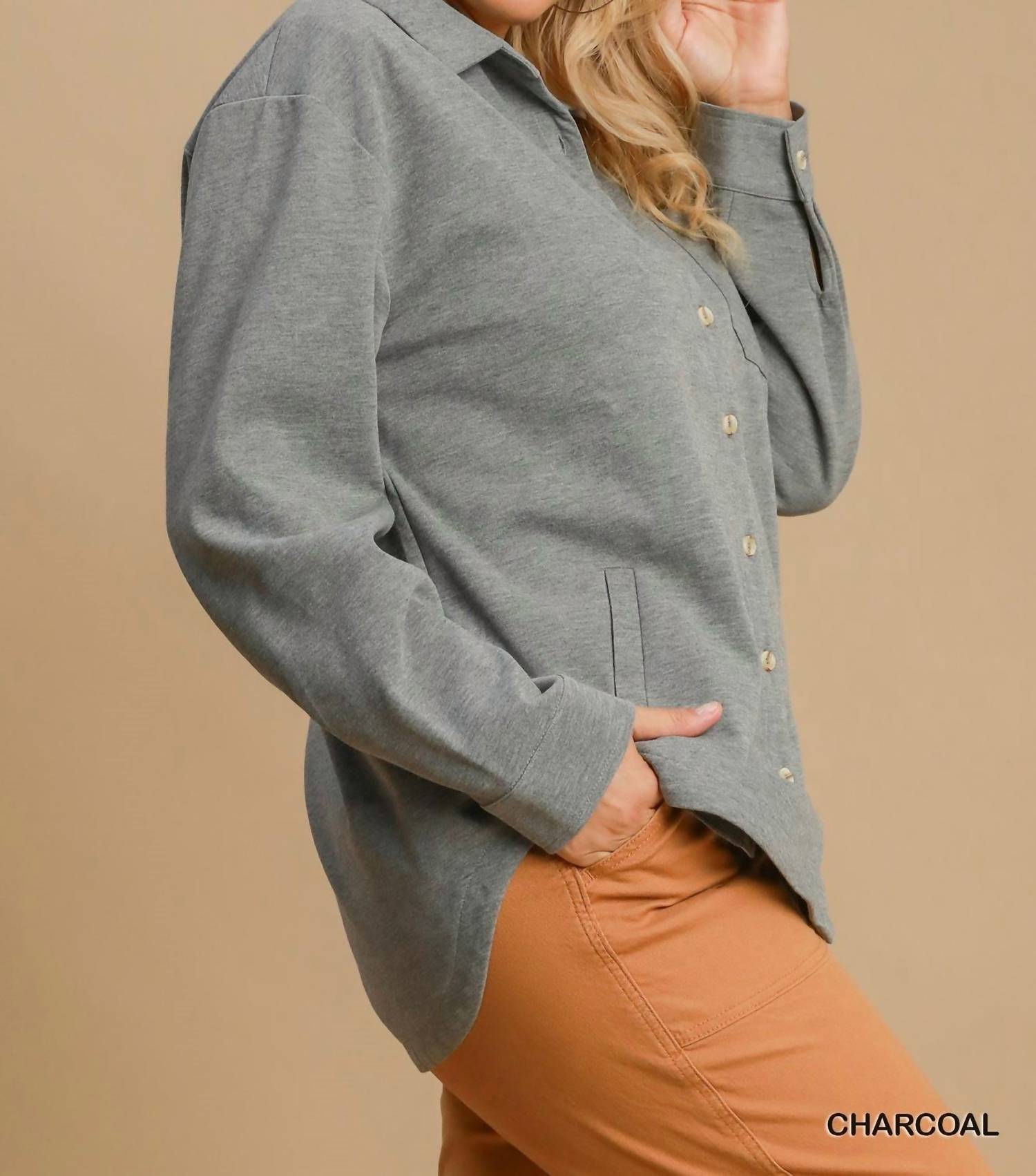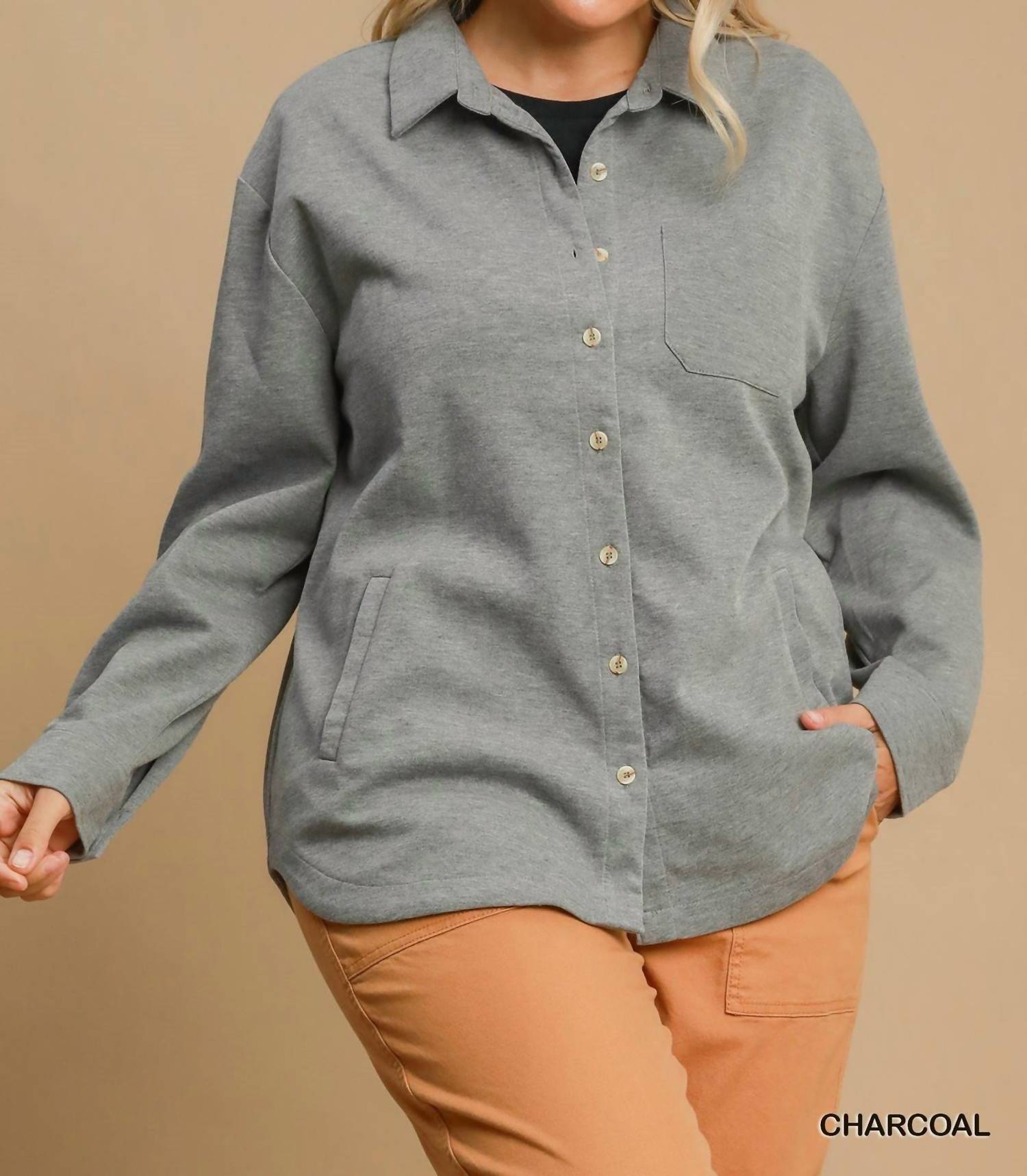 Представляем свободную куртку-рубашку Umgee Luxknit - идеальное дополнение к вашему гардеробу для создания стильных многослойных образов. Длинные рукава, изготовленная из хлопковой смеси (52% хлопка, 40% полиэстера и 8% спандекса), обеспечивают комфорт и гибкость. Эта куртка темно-серого цвета застегивается на пуговицы и имеет стильный воротник, практичные карманы и закругленный разрез по низу. Куртка доступна в размерах XL, 1X и 2X и обеспечивает свободную посадку по фигуре.