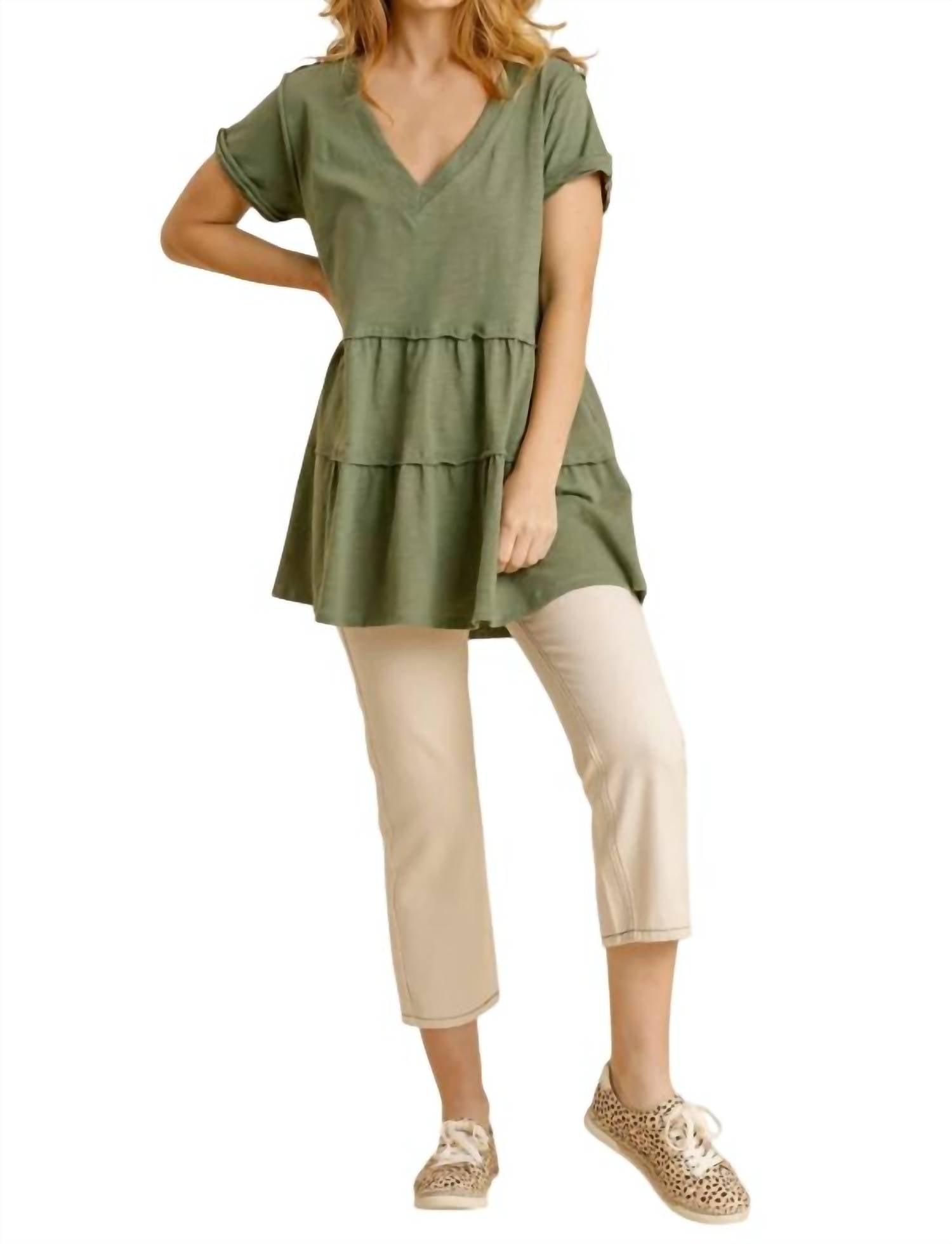 Откройте для себя универсальное очарование этой туники, которая идеально подходит как для многослойного ношения, так и в качестве самостоятельного образа. Ее изящный силуэт и стильные детали делают ее незаменимой в гардеробе. Насладитесь непринужденным стилем с туникой Umgee с многоярусными оборками в спокойном шалфейном оттенке. Эта модель из 100% хлопка имеет V-образный вырез и короткие рукава с манжетами, которые прекрасно дополняют многоярусный лиф с оборками и выгодно подчеркивают фигуру. Размеры: обхват груди 40 дюймов (101 см), длина 31 дюйм (78 см) для размера Small, доступны дополнительные размеры. Туника легко носить, она импортного производства и имеет удобную застежку-молнию. Уход: ручная стирка в холодной воде.