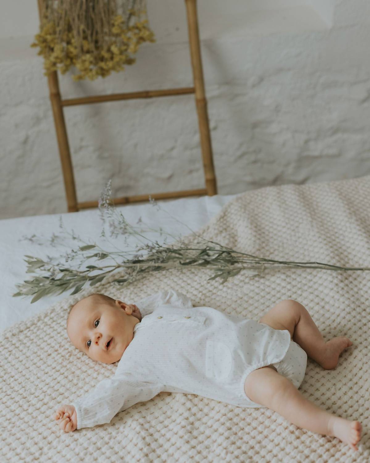 Подарите своему малышу комфорт и стиль с комбинезоном Baby's Stars от Búho с очаровательными длинными рукавами и принтом в виде звезд по всей поверхности. Этот комбинезон изготовлен из вуали из 100% органического хлопка, которая мягко прилегает к нежной коже. Изготовлен в Португалии из испанской ткани. Удобный вырез спереди с тремя пуговицами и застежкой на кнопки в шаговом шве для легкого надевания. Этот комбинезон с двумя передними карманами добавит игривости в любой ситуации, а его легко стирать в стиральной машине.
