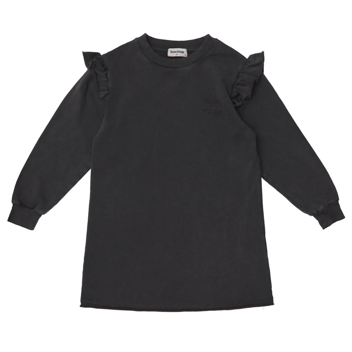 Плюшевое платье с оборками от Tocoto Vintage - очаровательное изделие для девочек, выполненное из 100% органического хлопка для максимального комфорта. Платье имеет длинные рукава с ребристыми манжетами и очаровательные оборки сверху. Спереди расположен узнаваемый логотип, добавляющий нотку аутентичности бренда. Это фактурное черное платье идеально подходит для повседневных случаев и сочетает в себе игривый стиль и роскошный комфорт.