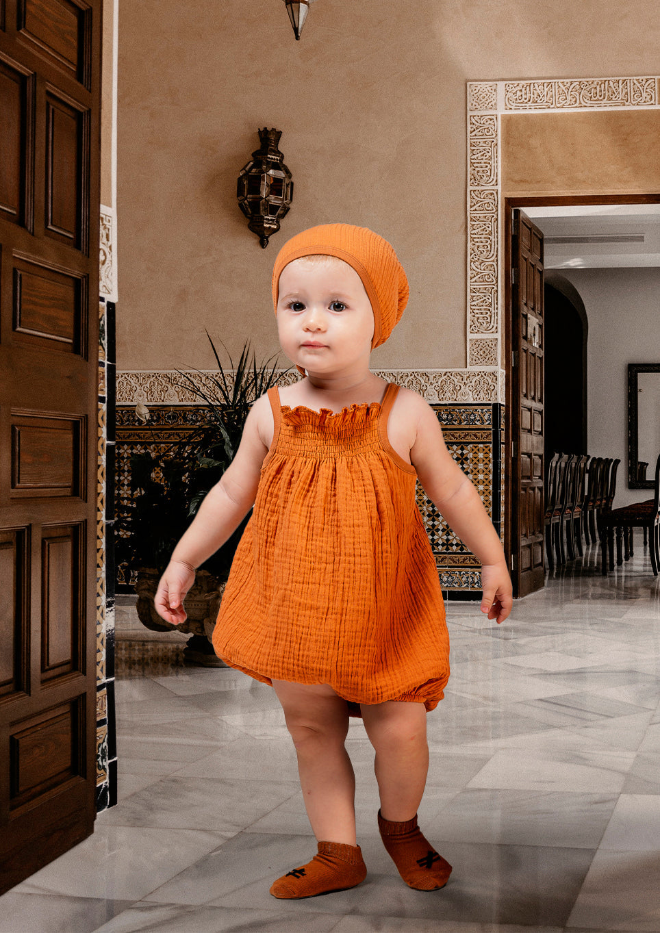 Комплект горчично-желтого цвета, гендерно-нейтральный, без рукавов и кепка с застежкой на пуговицы от Moi Noi. Этот комплект изготовлен из органического хлопка, не содержит никеля и канцерогенных материалов, не подвергается токсичным процессам печати и окрашивания. Изделие сертифицировано по стандартам OEKO-TEX и EAC.