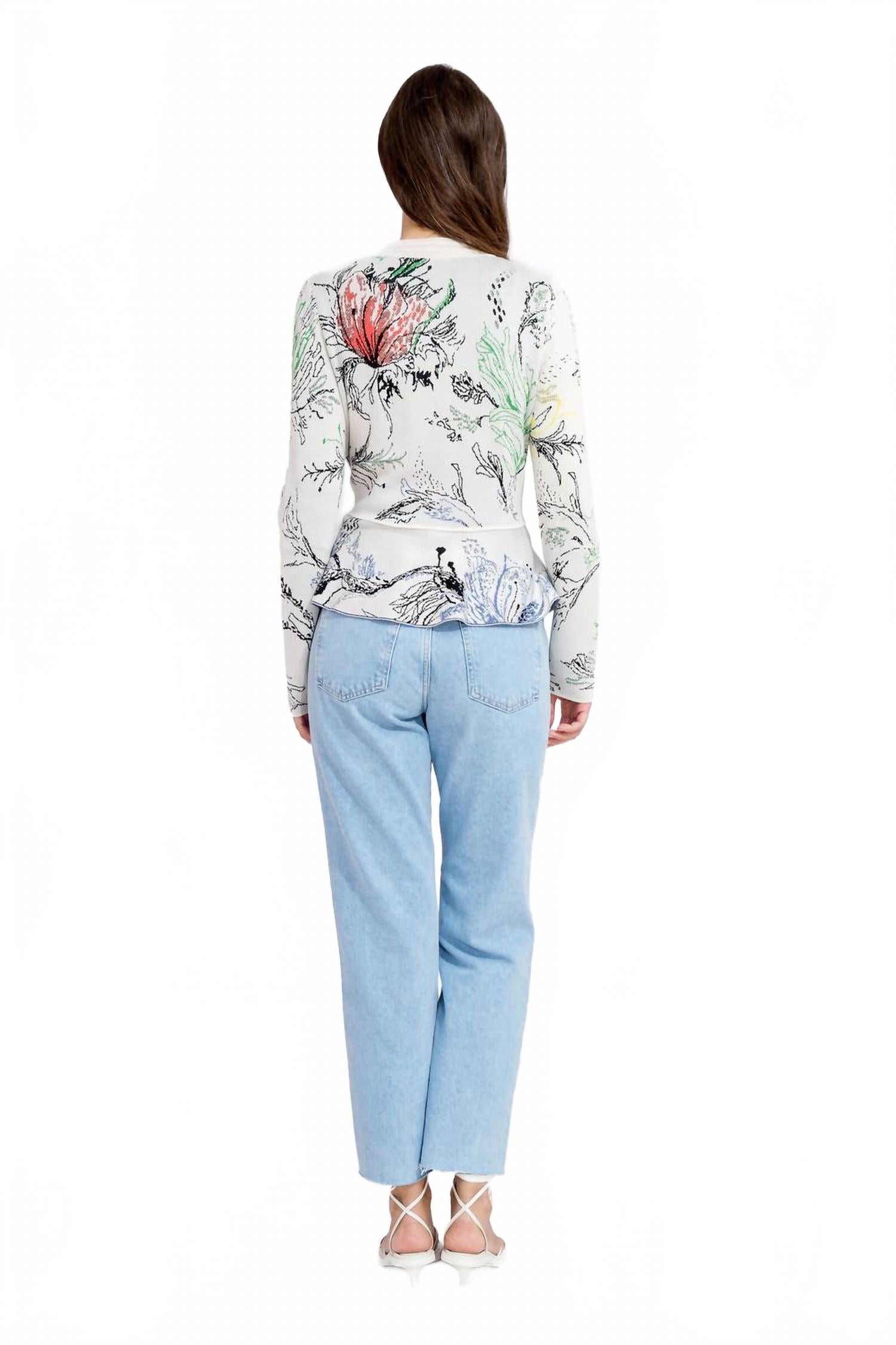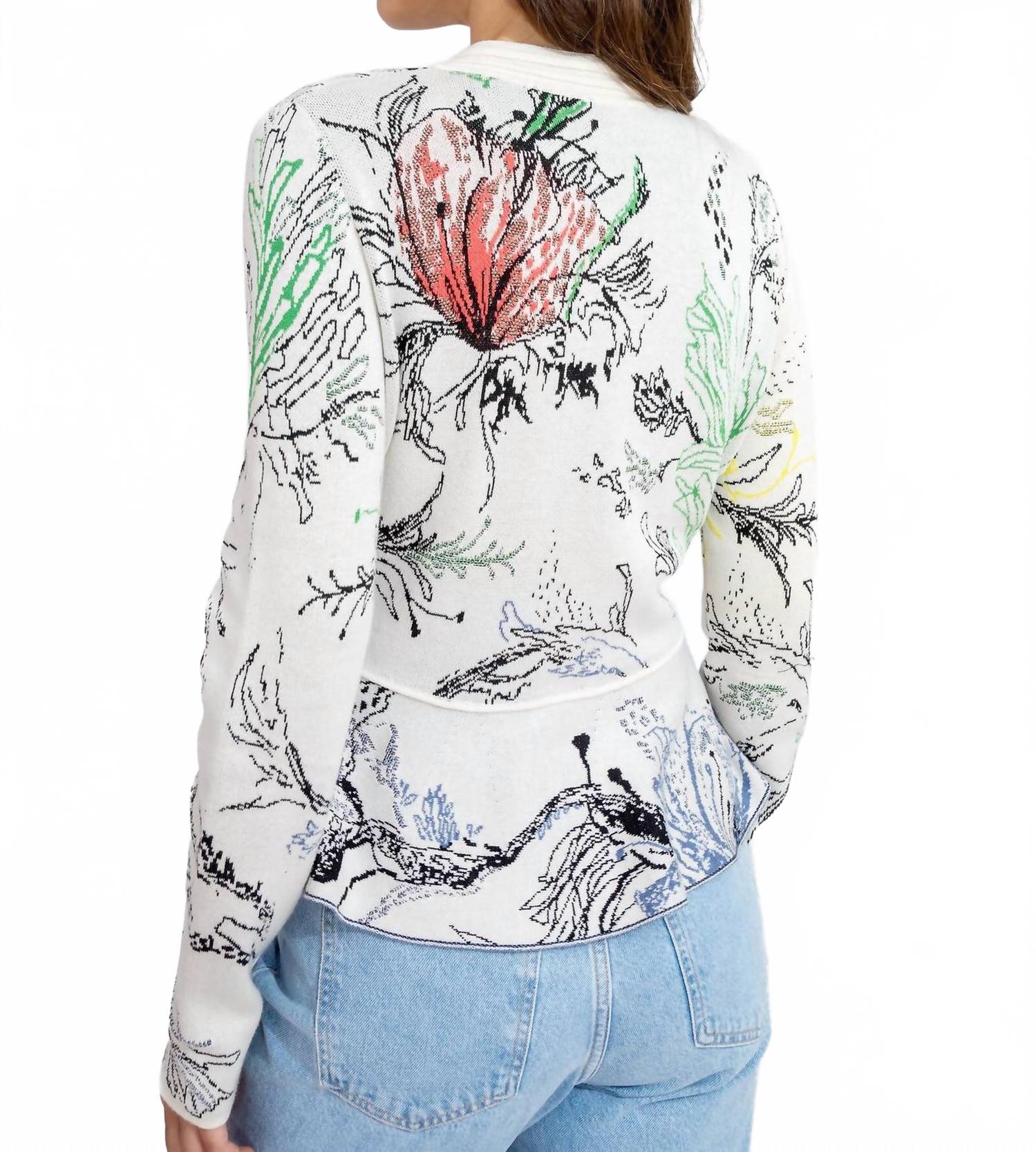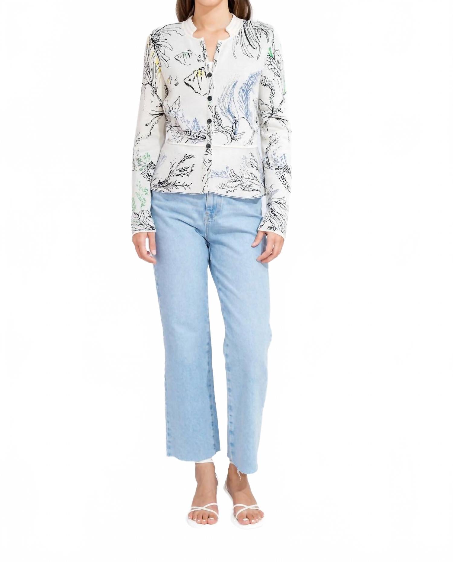 Накиньте этот очаровательный кардиган поверх любой майки или топа. Окунитесь в стиль с кардиганом Seabed Motif от IVKO, украшенным очаровательным подводным рисунком с яркими рыбками и морскими растениями. Этот женский кардиган с рукавами три четверти и воротником добавит элегантности любому образу. Изготовленный из смеси хлопка (65% хлопка и 35% вискозы), он комфортный и дышащий. Застежка: пуговицы.