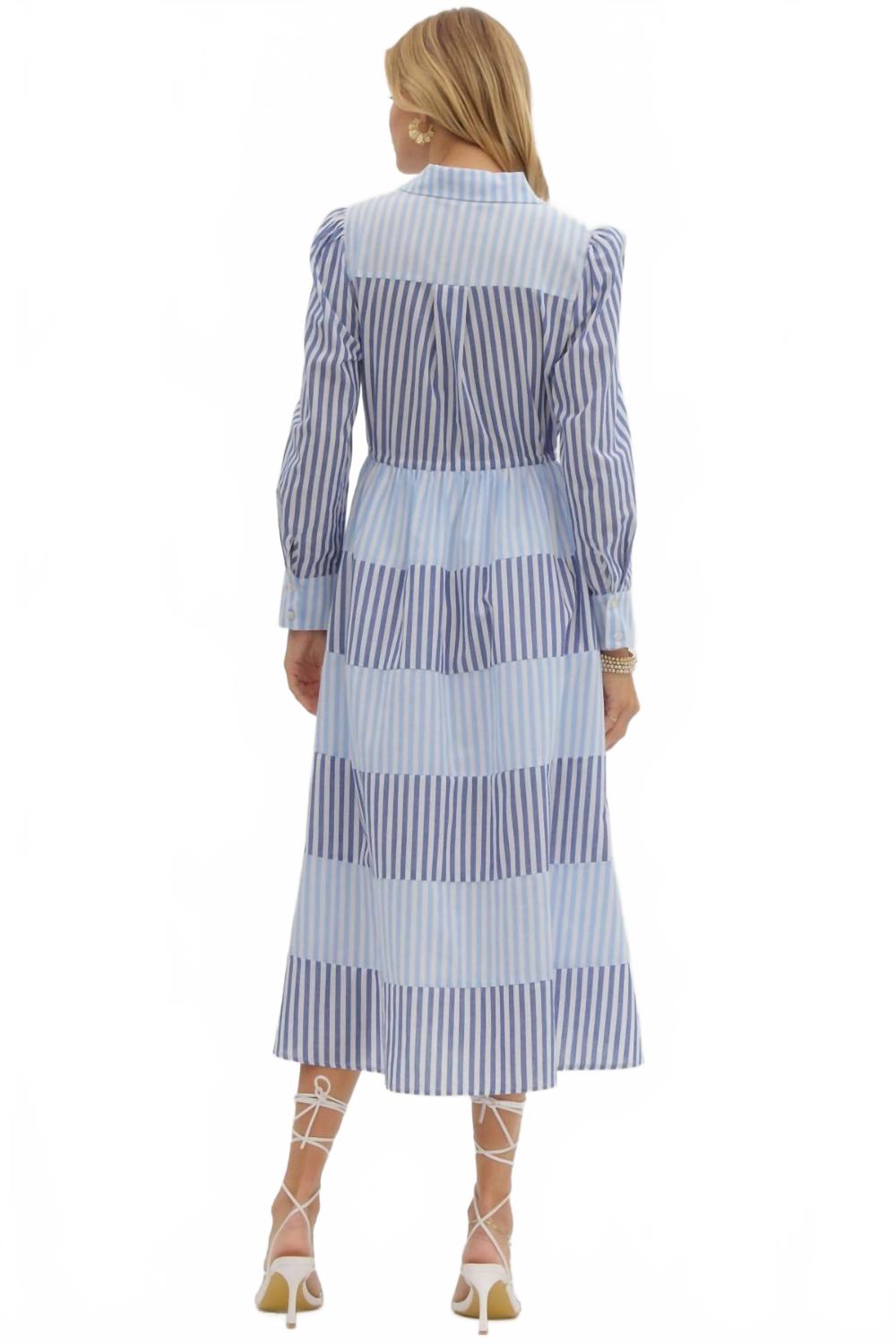 Платье идеальной длины существует. Представляем платье-миди Haven Stripe от Entro - эффектное украшение, которое украсит ваш гардероб. Это синее хлопковое платье с полосатым узором, воротником-стойкой, длинными рукавами и свободным силуэтом. Застежка на пуговицы и регулируемый пояс с помощью шнурка позволяют подогнать его по фигуре. Инструкция по уходу: машинная стирка и сушка в стиральной машине.