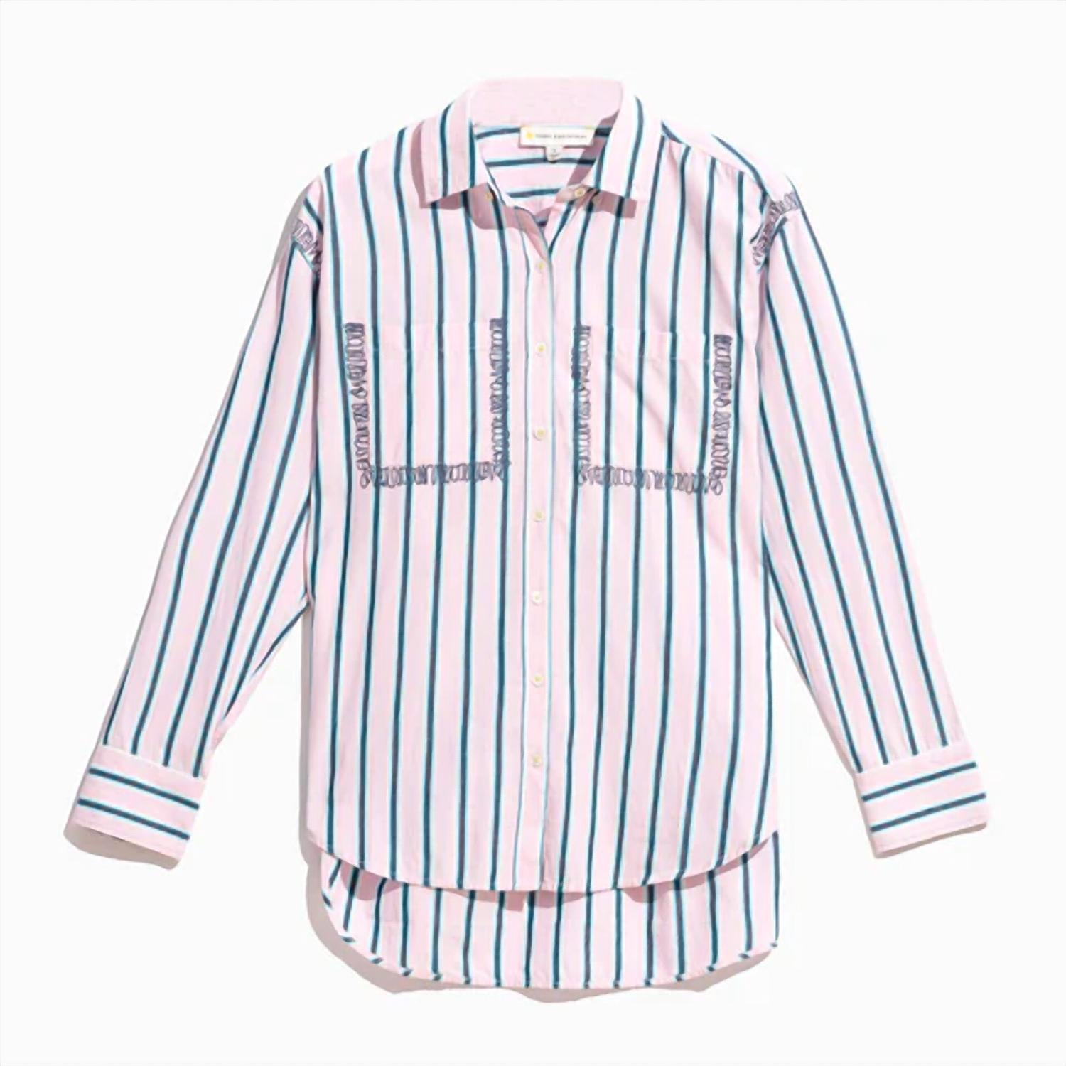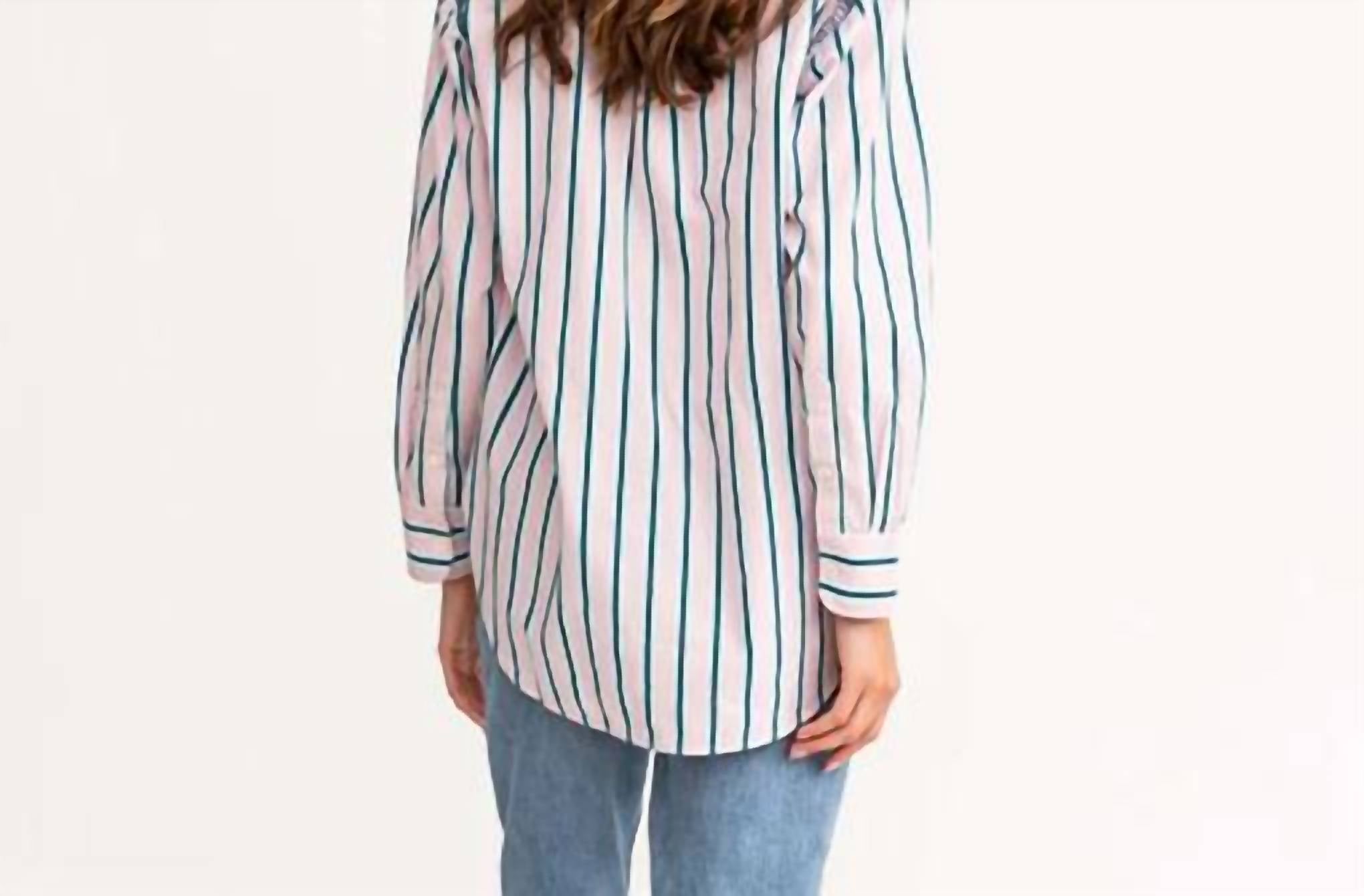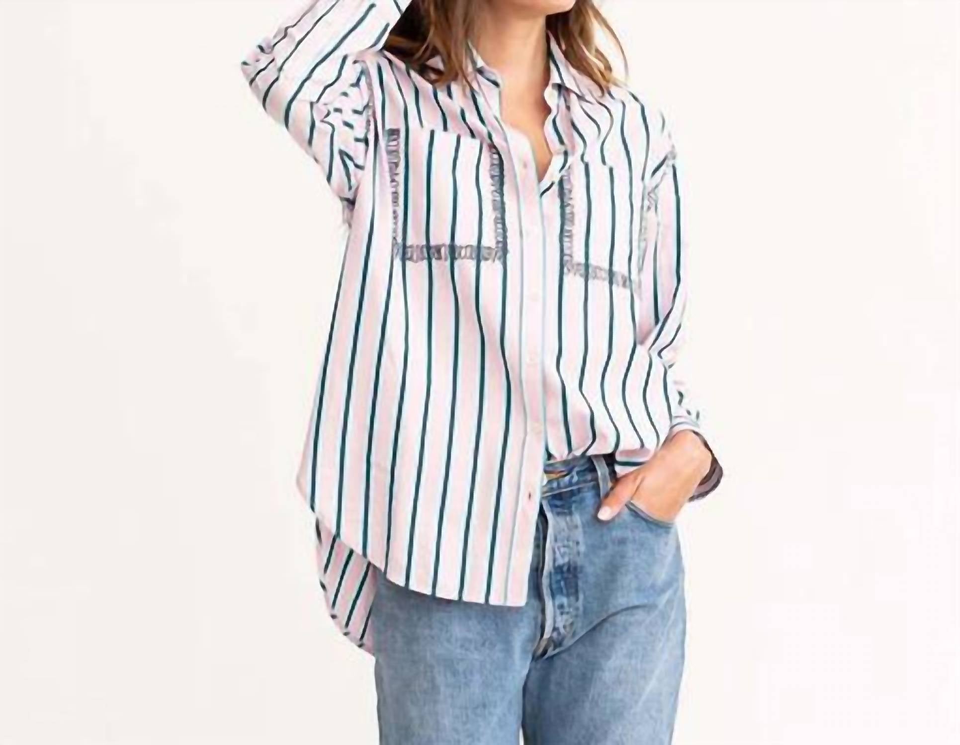 100% хлопок. Длина спереди 33 дюйма (размер S). Отложной воротник. Длинные рукава. Застежка на пуговицы спереди. Нагрудные карманы. Длинный подол рубашки. В полоску. Машинная стирка в холодной воде. Рост модели 178 см, размер S.