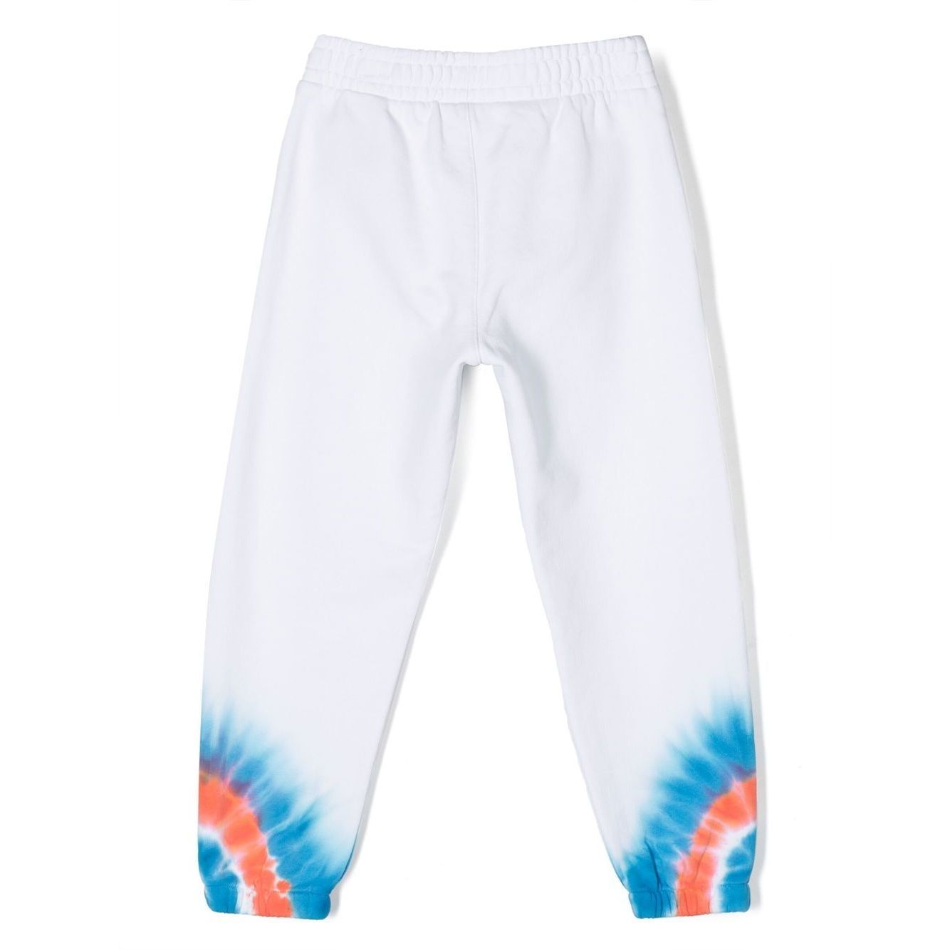 Белые спортивные брюки с принтом в стиле тай-дай синего и красного цветов на штанинах. Эластичный пояс и манжеты на щиколотках.