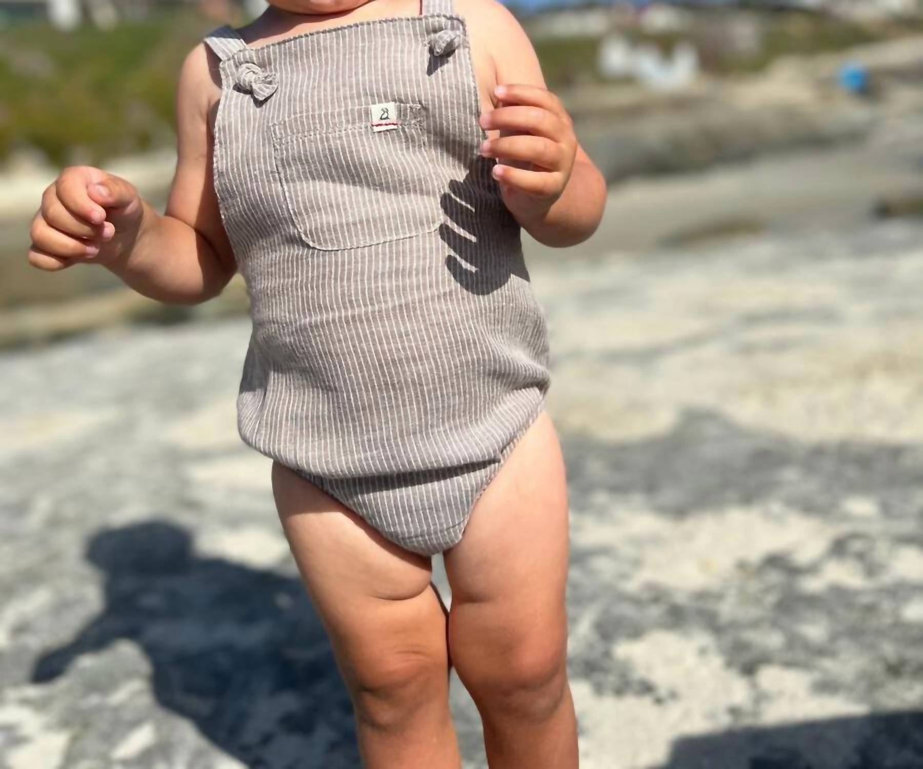 Легкая коричневая куртка-бомбер с белыми полосками, завязанными лямками и передним карманом. 100% хлопок.