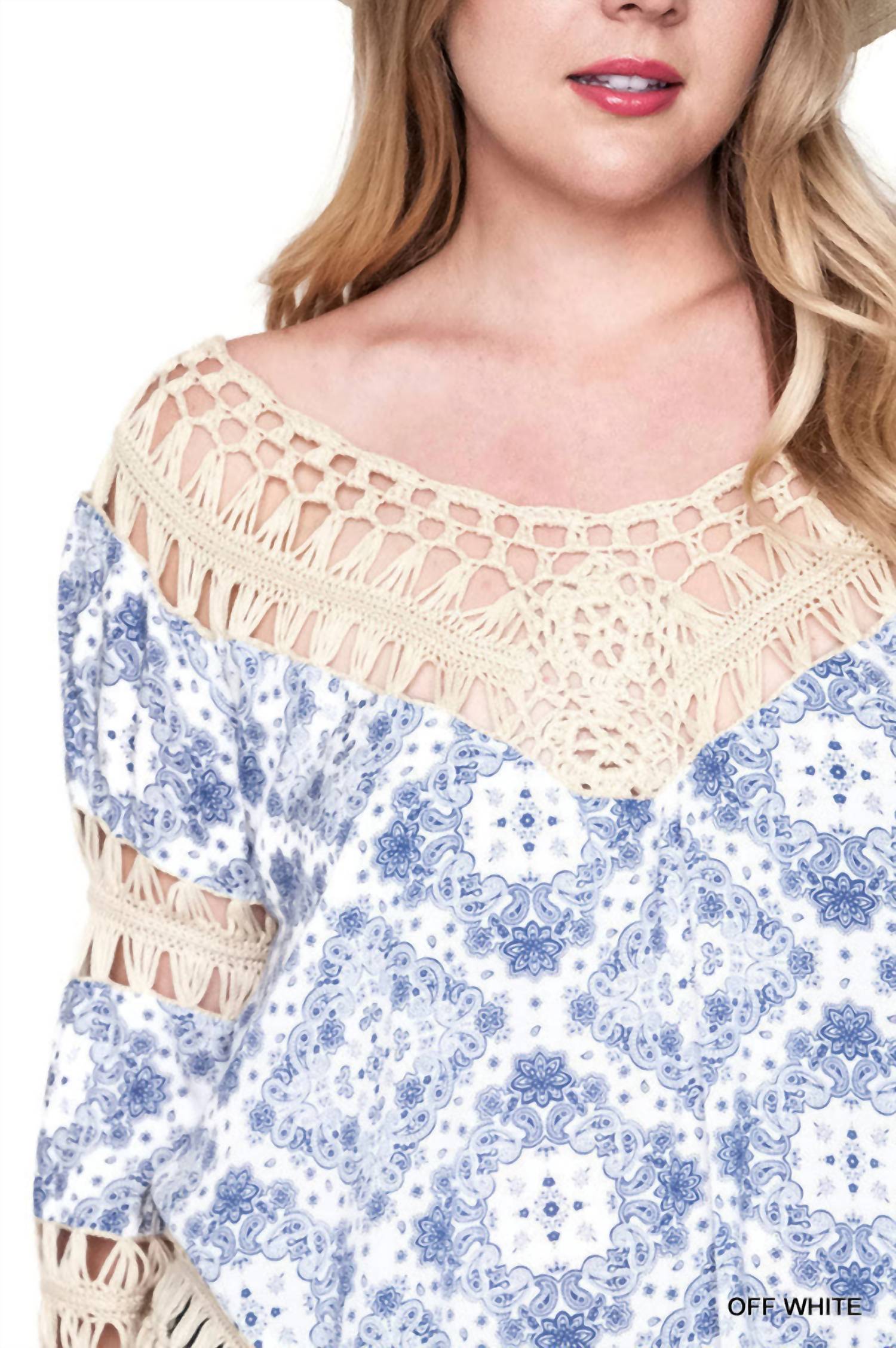 Блузка, которая никогда не выйдет из моды. Представляем топ с принтом «Крючок и бахрома» от Umgee - стильную блузку нежно-белого цвета, идеально подходящую для весенних концертов. Этот топ с узором, рукавами до локтя и А-силуэтом, выгодно подчеркивает фигуру, выполнен в красивом дизайне с бахромой, прозрачными вставками и V-образным подолом. Изготовлен из смеси хлопка (65% хлопка и 35% полиэстера), он обеспечивает комфорт и при этом выглядит модно. Застежка: надевать. Уход: стирать в холодной воде отдельно, сушить на горизонтальной поверхности. Доступно в размерах XL, 1X и 2X, с обхватом груди 46, 48 и 50 дюймов соответственно.