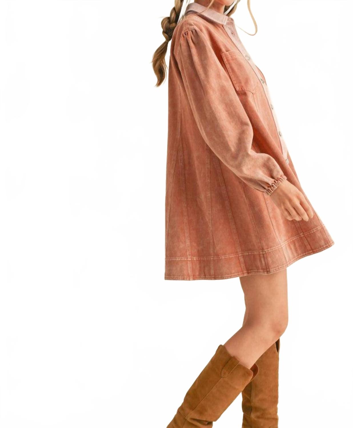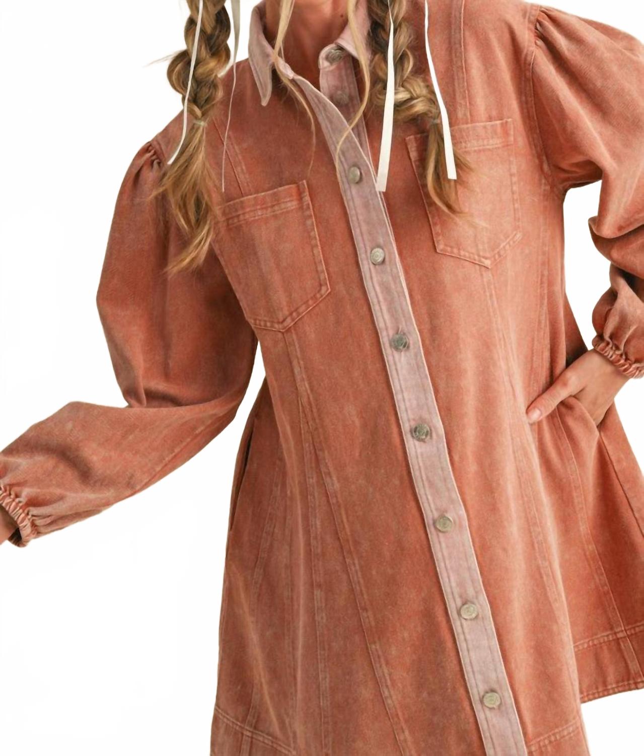 Комфортное и элегантное платье, которое вы будете носить круглый год. Откройте для себя стильное мини-платье Edge Line Denim от ;merci - идеальное дополнение для женщин, которые ценят комфорт и модную строгость. Это платье с длинными рукавами выполнено из хлопка в терракотовом цвете и имеет шикарный свободный силуэт, воротник-стойку и удобные карманы. Привлекательный дизайн включает контрастные цвета на передних пуговицах. Застежка - пуговицы. Рекомендации по уходу: машинная стирка и сушка в стиральной машине, что облегчает уход.