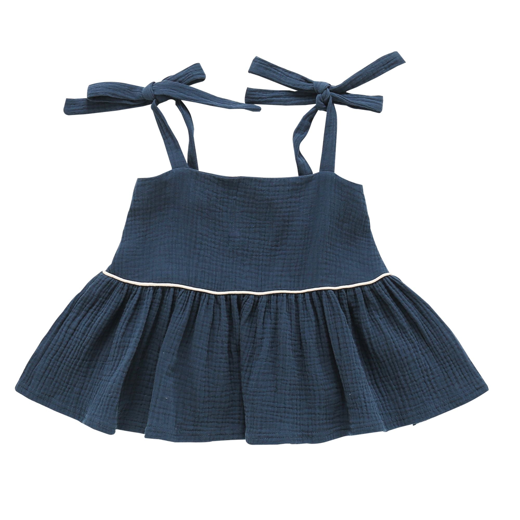 Этот топ с баской, достаточно нарядный, но такой удобный для повседневных приключений, с достаточно интересными деталями (завязками сзади, контрастной окантовкой) идеально подходит к леггинсам или джинсовой юбке. Эластичная спинка. Застежка на пуговицы. Этикетка с логотипом из искусственной замши. Ткань: 100% хлопковая марля.
