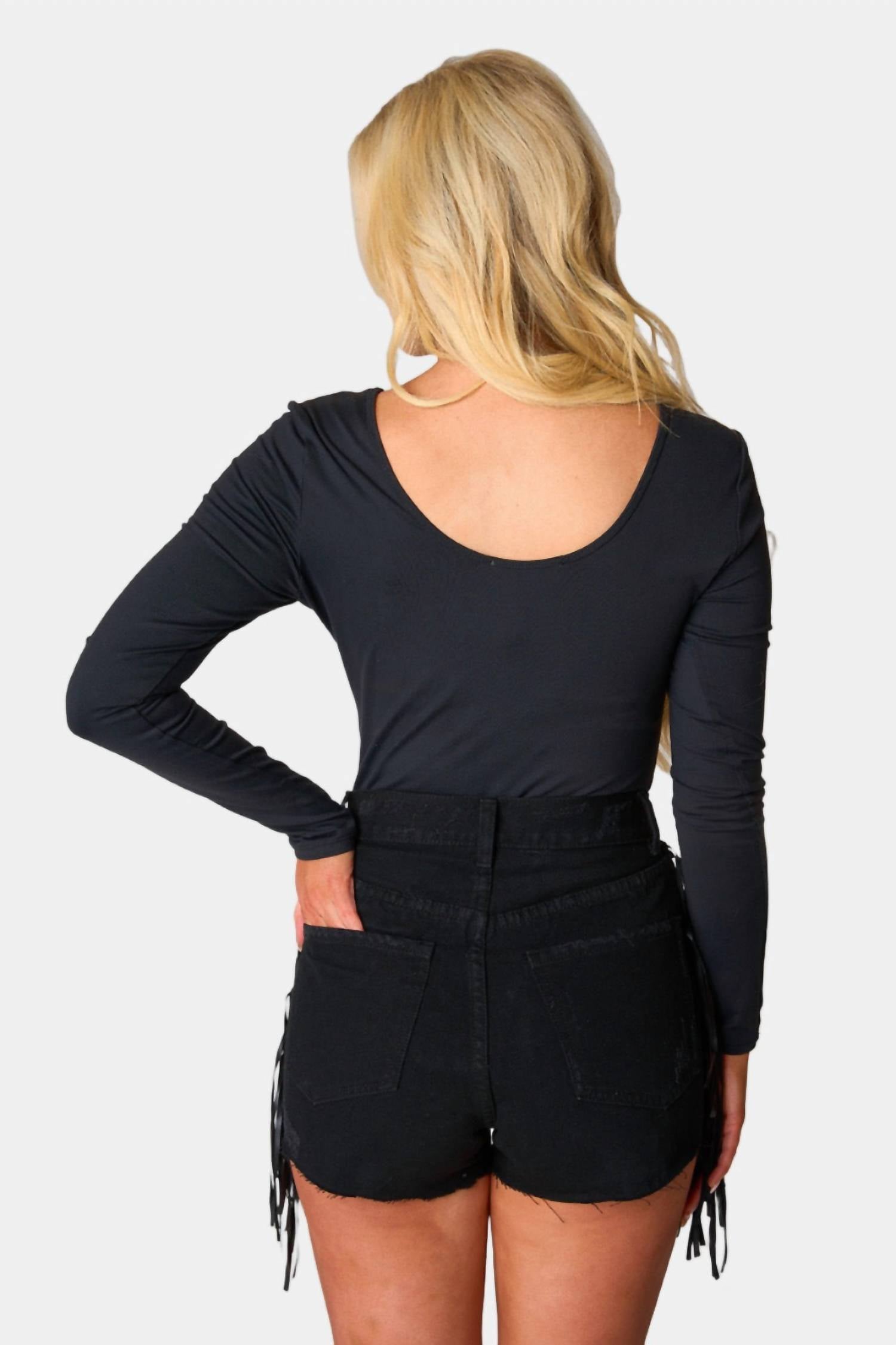 С черной бахромой из искусственной кожи по бедрам. Длина внутреннего шва 2,5. Ткань не тянется. Рост модели: 175 см, бюст: 88 см, талия: 48 см, бедра: 88 см. На модели размер 25. Машинная стирка в холодной воде. 100% хлопок.