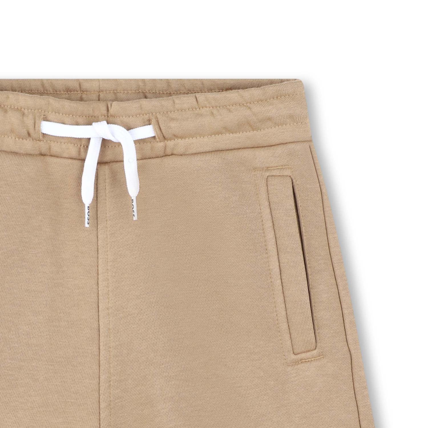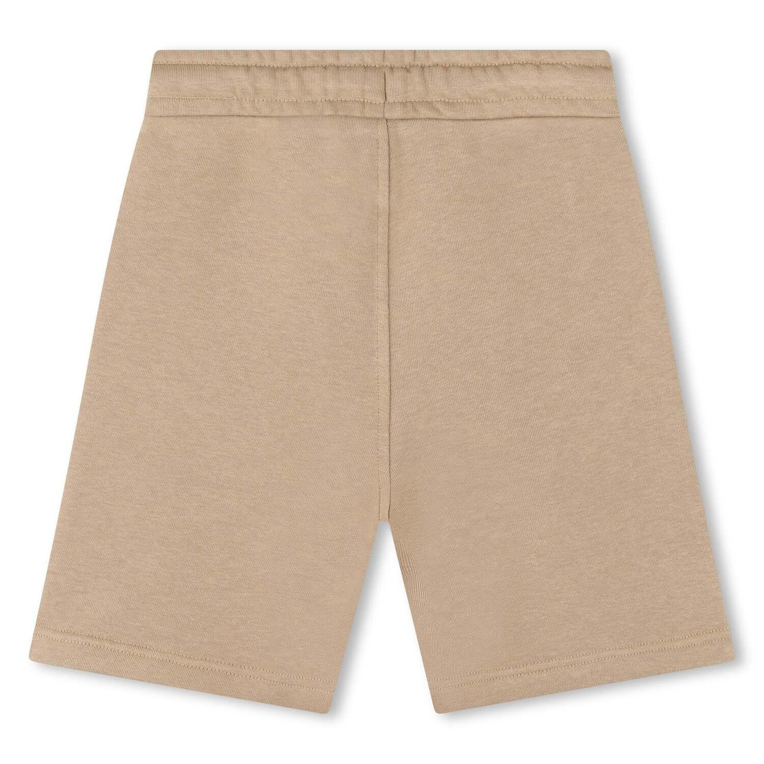 Коричневые шорты для мальчиков от BOSS. Изготовлены из хлопкового трикотажа средней плотности. На штанине напечатан белый логотип бренда. Передние карманы прострочены. Эластичный пояс с белым шнурком с логотипом обеспечивает идеальную посадку.