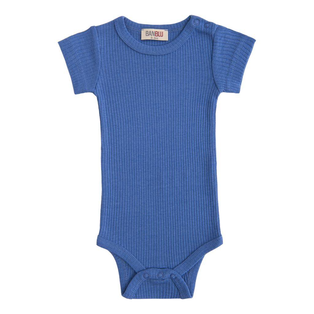 Синий модальный боди с короткими рукавами для младенцев от BANBLU, нейтральный для пола, из мягкой и удобной хлопковой модальной смеси, с круглой горловиной, короткими рукавами, застежкой на плечах и внизу на пуговицы.