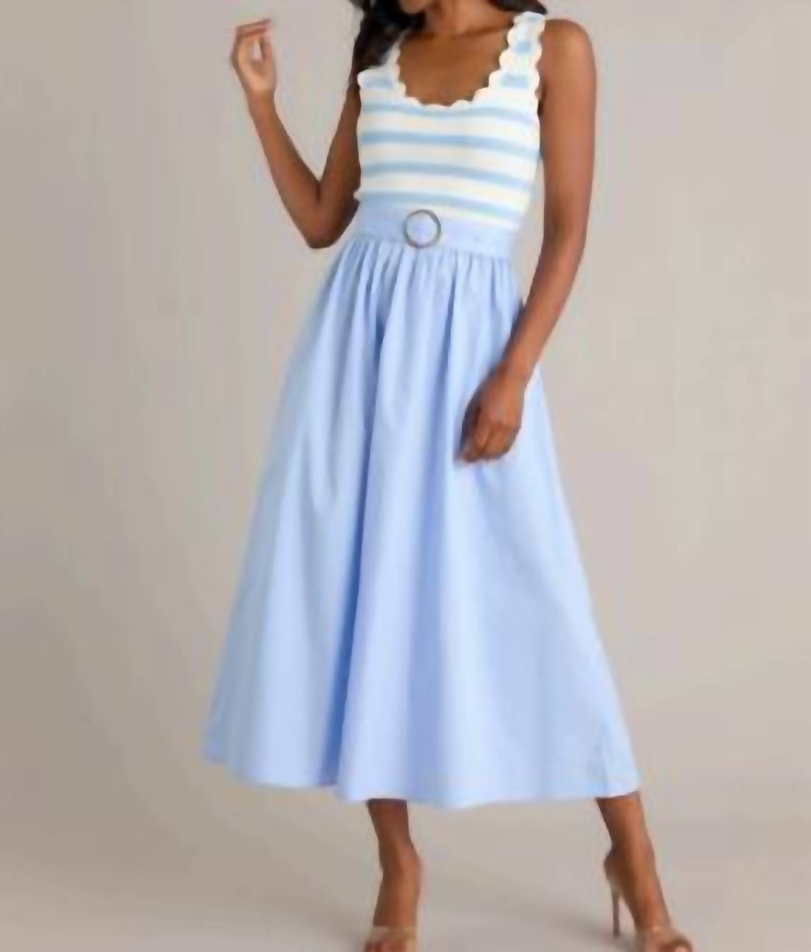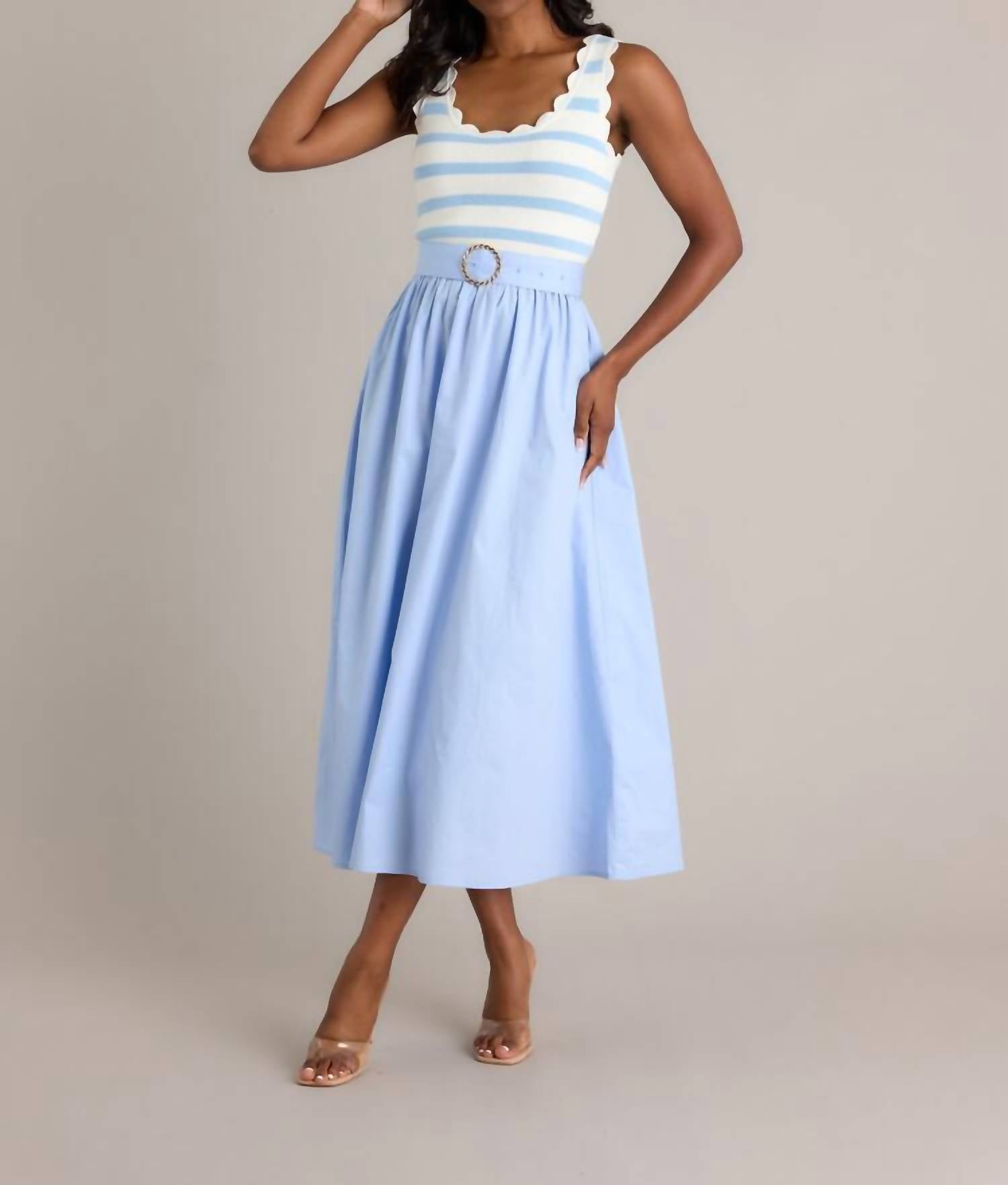 Представляем платье-миди Greer от Prosperina - классическую модель в полоску Blue Belle, идеально подходящую для летнего отдыха. Это платье без рукавов с круглым вырезом и А-образным силуэтом выполнено полностью из дышащего 100% хлопка. Комбинированный дизайн включает хлопковый трикотажный верх с фестончатыми краями и струящуюся, легкую юбку, дополненную тканевым поясом с золотыми акцентами. Застежка - на застежке.