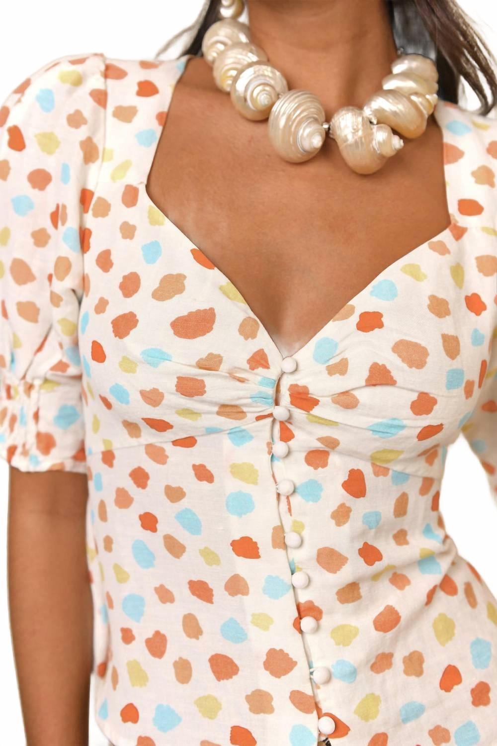 Представляем топ Palma от RIXO - великолепную женственную блузку с пленительным принтом в виде тюльпанов из мягкой льняной ткани (55% лен, 45% вискоза). Этот женский топ с элегантными рукавами до локтя и привлекательным вырезом в форме сердечка идеально подходит для летнего гардероба. Застежка - молния. Уход - только химчистка.