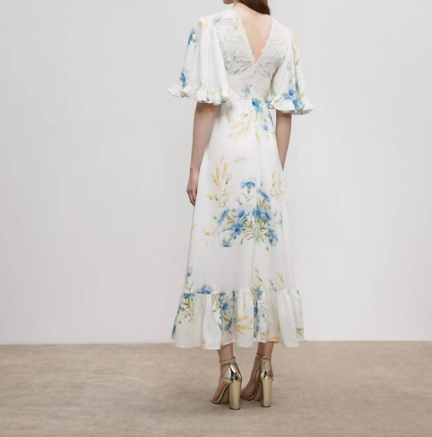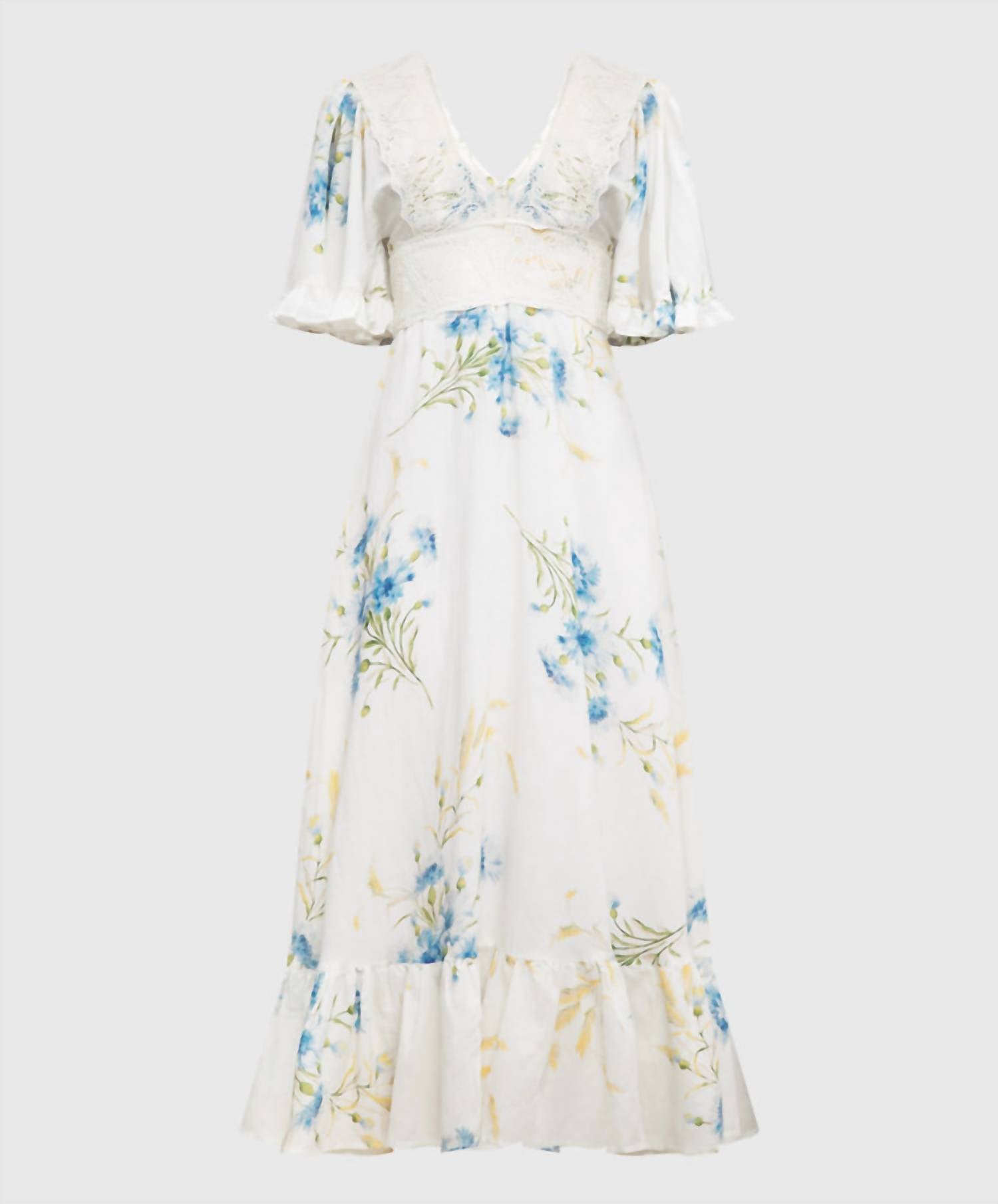 Представляем льняное макси-платье с оборками от byTiMo - идеальный выбор для вашего весеннего гардероба в элегантном оттенке «Голубая солома». Это женское макси-платье с расклешенными рукавами до локтя и V-образным вырезом, украшенным изящной вышивкой, демонстрирует приталенный силуэт с завышенной талией, переходящий в пышную юбку с цветочным узором. Платье выполнено из роскошной смеси льна и вискозы и изящно застегивается на молнию сзади. Идеально подходит для вечерних мероприятий, воплощая суть стиля бохо-шик благодаря изящным оборкам на подоле и манжетах.