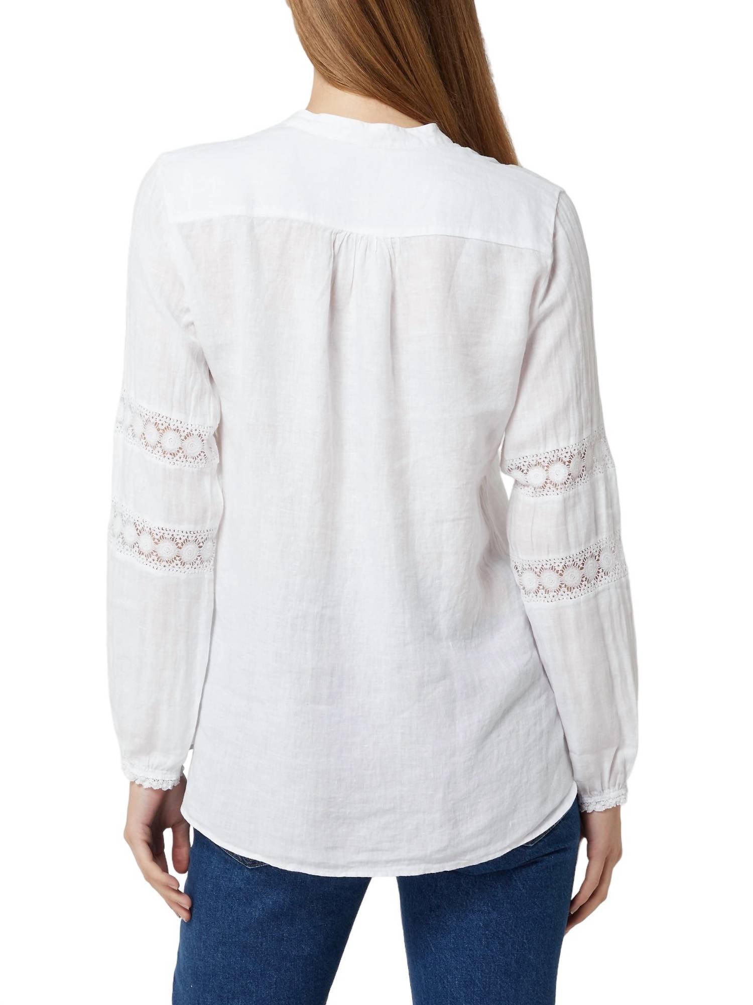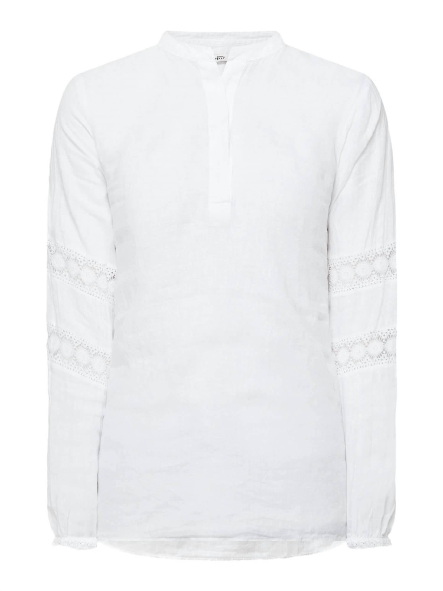 Универсальная блузка, которая подойдет как для работы, так и для ужина! Воротник-стойка и длинные рукава с эластичными манжетами, украшенными кружевной отделкой. Закругленный подол с разрезом добавляет стильный штрих, а планка с пуговицами обеспечивает классическую застежку. Изготовлена ​​из 100% льна. Рекомендуется бережная стирка при температуре 40°C.