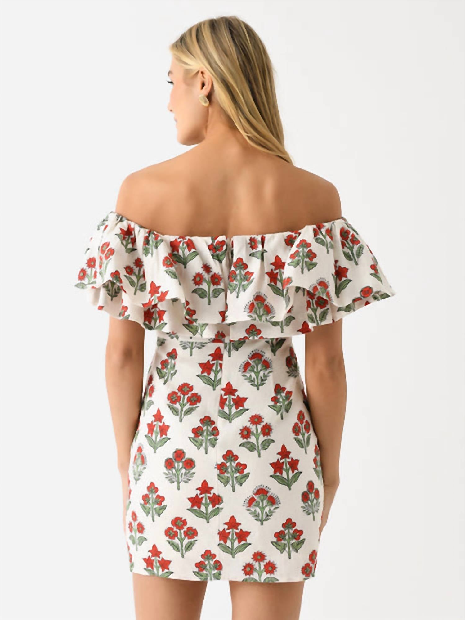 Льняная ткань средней плотности, неэластичная. Отделка оборкой. Вырез горловины с открытыми плечами и нескользящей резинкой. Застежка на крючок и потайную молнию сзади. На подкладке. Химчистка. Импортный товар.