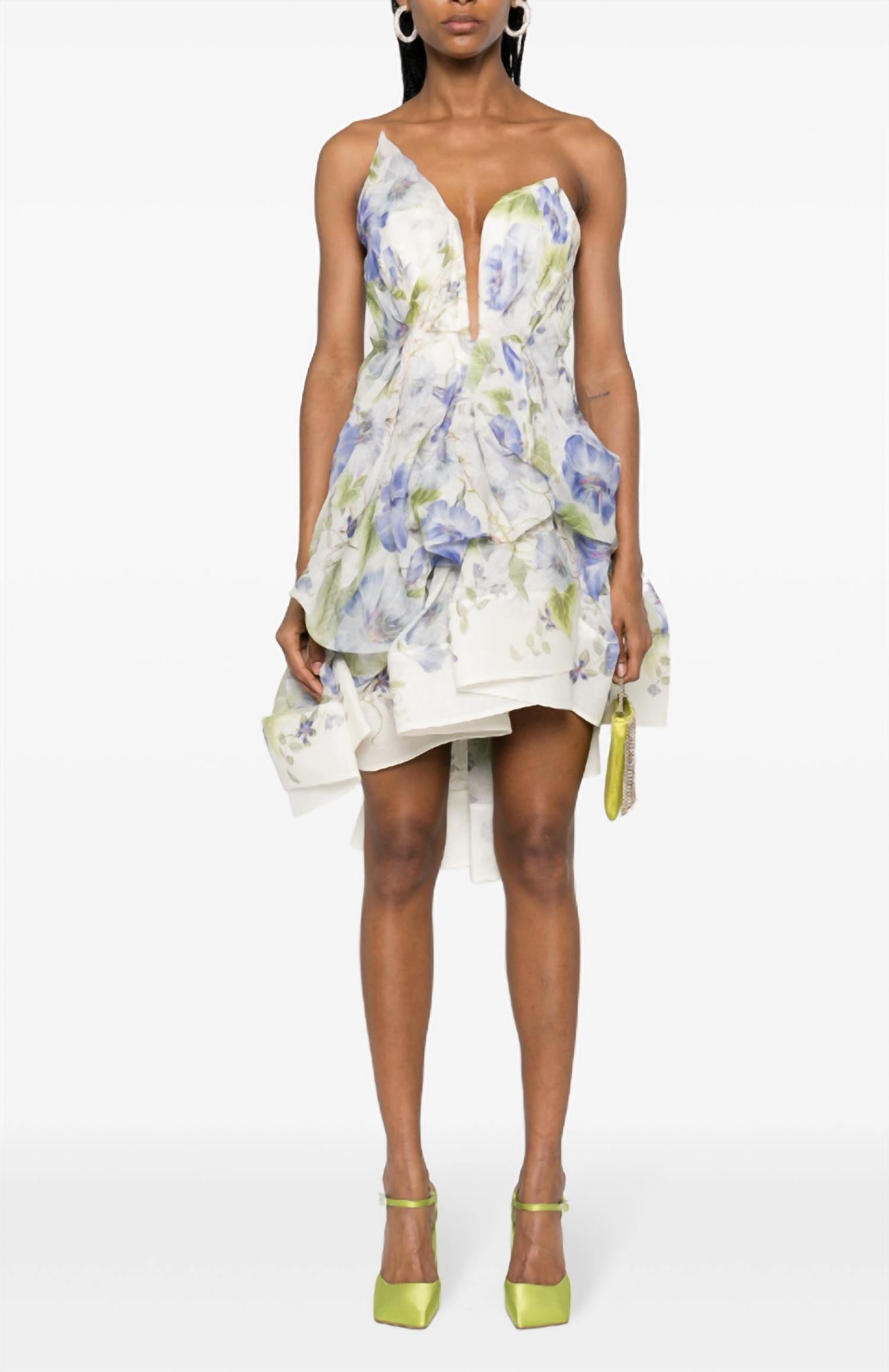 Откройте для себя вневременную элегантность женского платья миди Natural Liftoff от Zimmermann. Это очаровательное изделие из смеси белого и разноцветного льна и шелка отличается фактурной отделкой и сплошным цветочным принтом. Платье выполнено в стиле корсета с V-образным вырезом и приталенной линией талии, дополненной складками и оборками. А-силуэт длиной до бедра дополнен подкладкой и стильным асимметричным подолом, что придаст изысканность любому образу.