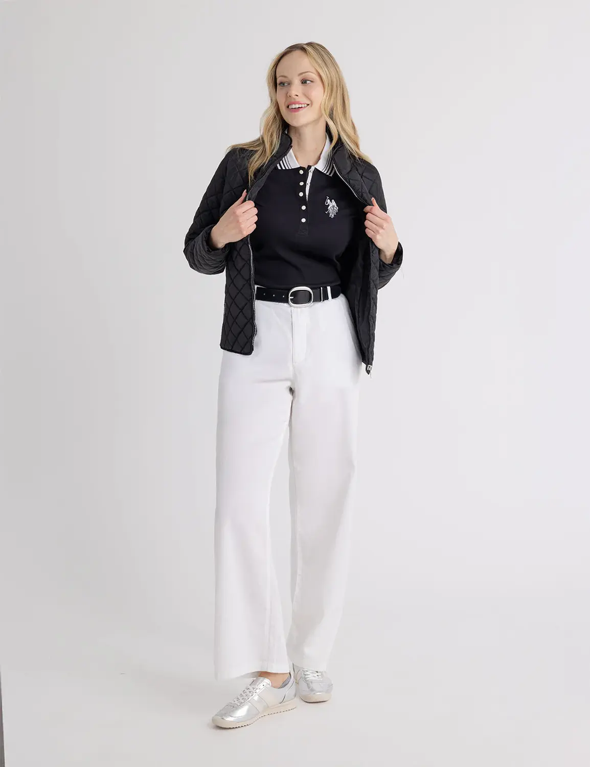 Ощутите стиль и комфорт в байкерской куртке Quilted Side Knit Moto Jacket от US Polo Assn. Эта куртка сочетает в себе классическую ромбовидную стежку и эластичные трикотажные боковые вставки, обеспечивая тепло и свободу движений. Силуэт в байкерском стиле дополнен золотистой фурнитурой и элегантной застежкой-молнией спереди, а воротник-стойка добавляет элегантности. Эта куртка отлично подходит как для повседневной носки, так и для создания элегантного образа.