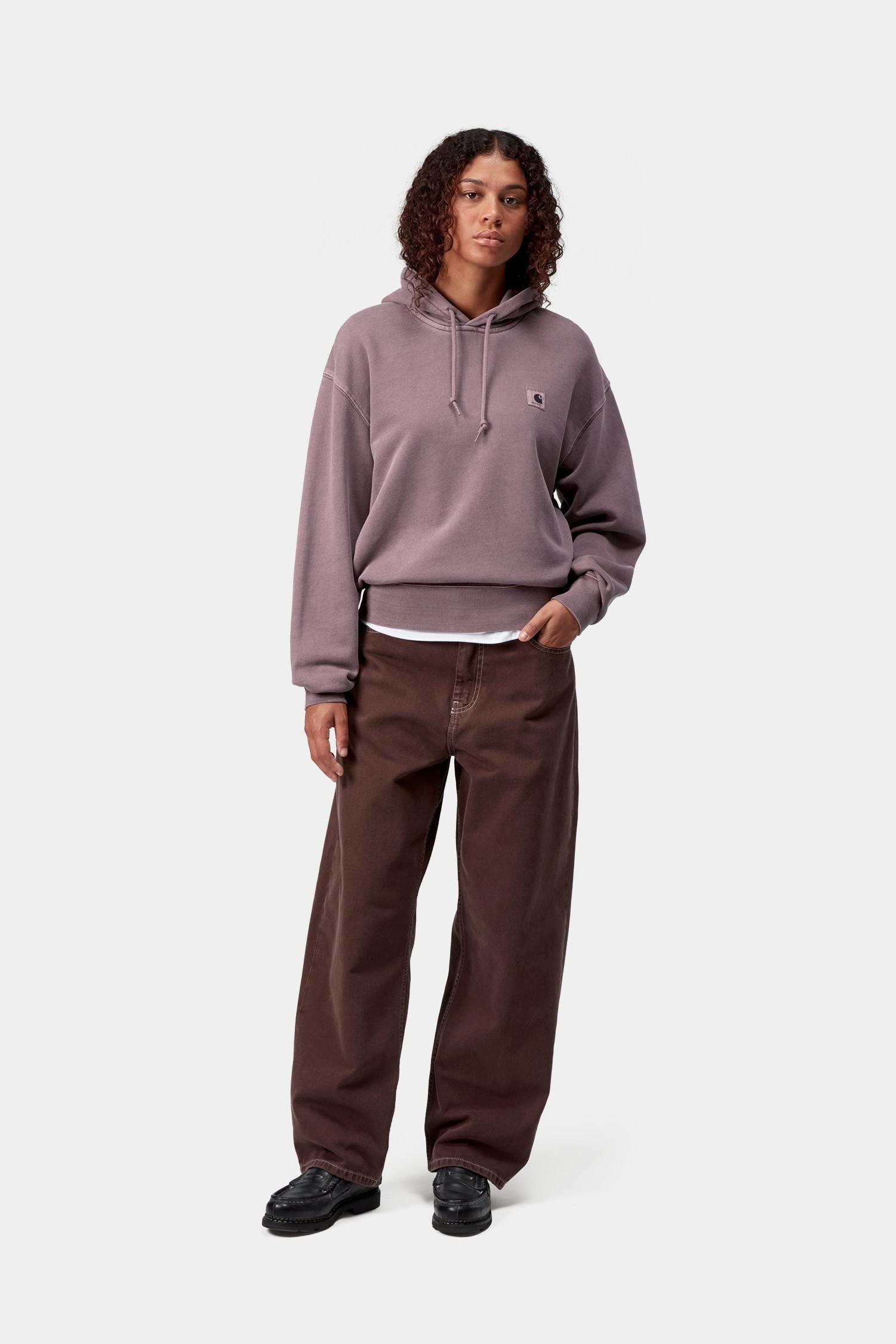 Женская толстовка Nelson с капюшоном изготовлена из неначесаного хлопкового трикотажа, что обеспечивает ей приятную на ощупь петлевую конструкцию. Модель имеет свободный крой, немного более свободный и угловатый, но при этом характеризующийся спущенными плечами и ребристыми краями, создающими эффект облегания. Кроме того, толстовка окрашена в готовом виде, что придает ей стираный, но насыщенный оттенок. На левой стороне груди расположена тканая квадратная этикетка, которая приобрела мутный оттенок в процессе окрашивания.