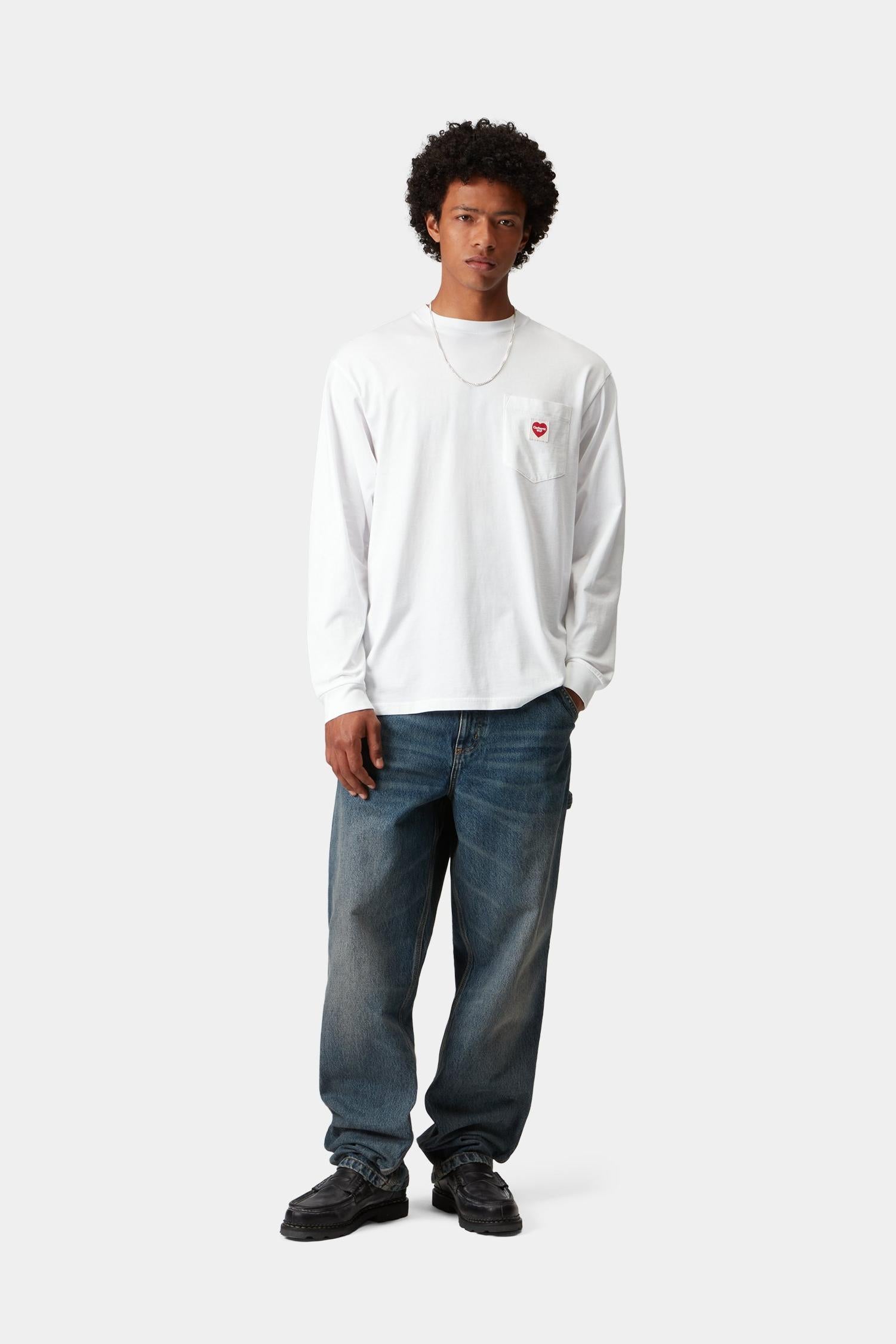 Футболка с длинным рукавом и карманом в форме сердца свободного кроя выполнена из легкого хлопкового трикотажа. На нагрудном кармане находится лейбл в форме сердца.