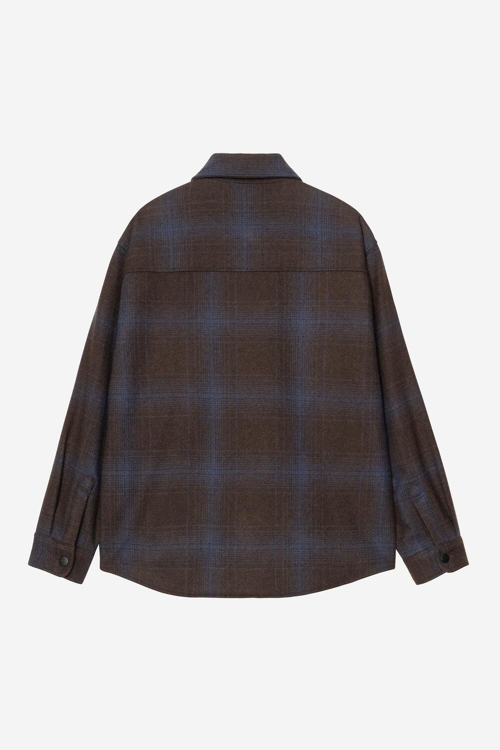 Куртка-рубашка Brennan изготовлена из шерстяной ткани средней плотности с клетчатым узором по всей поверхности и саржевой подкладкой. На нагрудном кармане находится тканая квадратная этикетка.