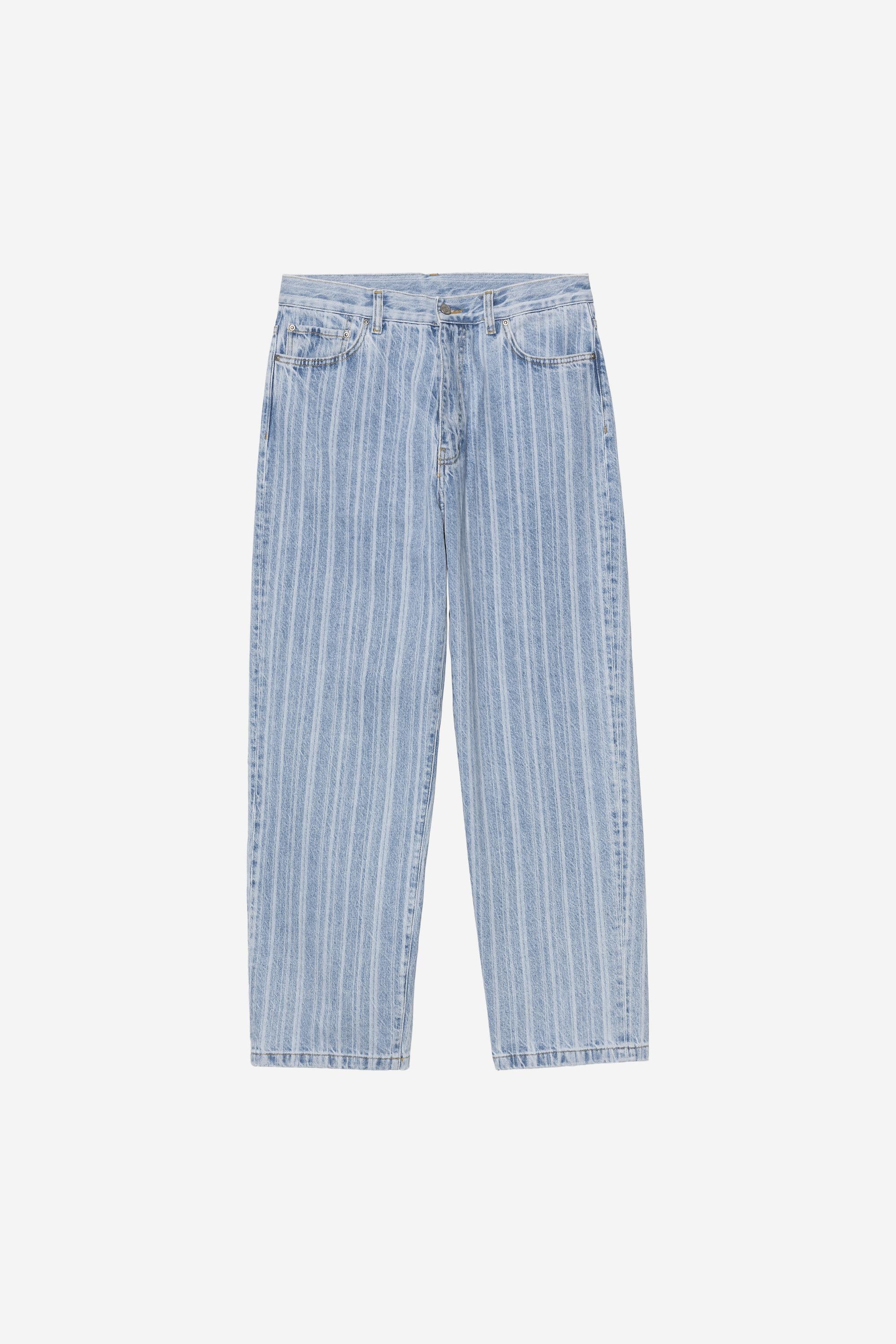 Брюки Rylan свободного зауженного кроя из плотного хлопкового денима с полосками по всей длине. Изделие дополнено кокеткой сзади и закрепками в местах повышенной нагрузки. На заднем кармане находится тканая квадратная этикетка.