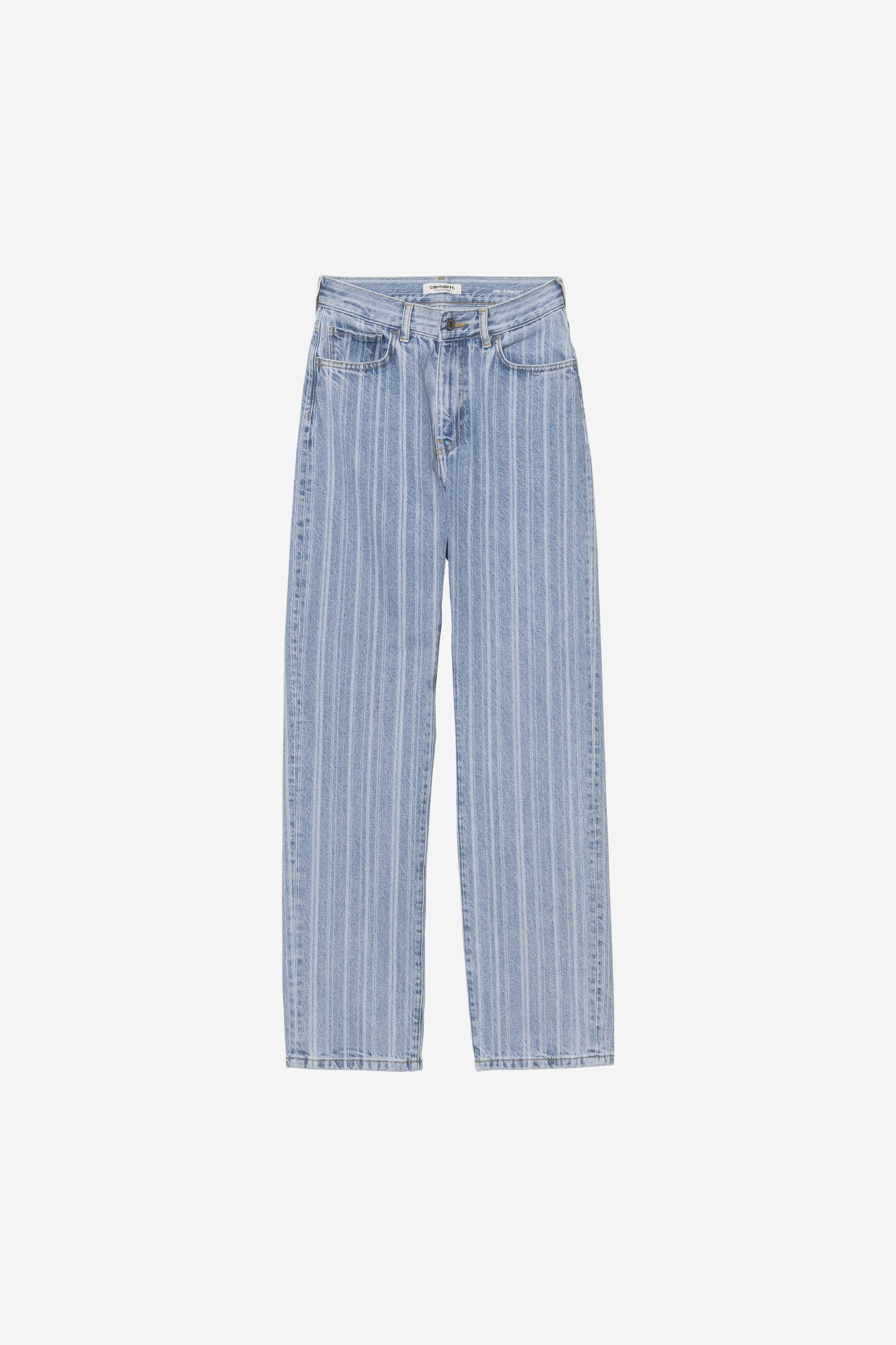 Женские брюки Rylan прямого кроя из плотного хлопкового денима с полосками по всей длине. Изделие дополнено кокеткой сзади и закрепками в местах повышенной нагрузки. На заднем кармане находится тканая квадратная этикетка.