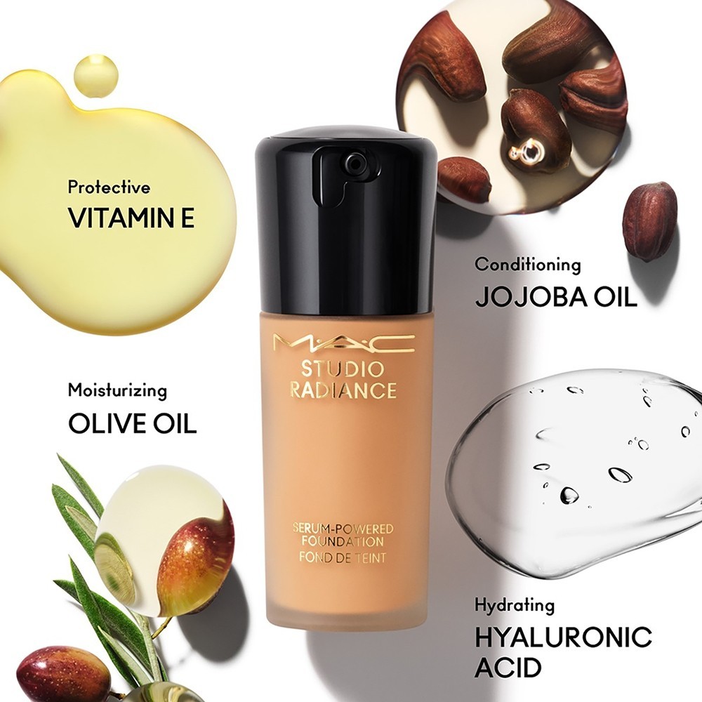 Это революционное новшество обеспечивает на 209% больше увлажнения, делая кожу более упругой, гладкой и сияющей. Наш передовой продукт также помогает коже со временем стать более увлажненной и здоровой, сохраняя ее сияние в течение дня. В состав тональной основы входит 80% ухаживающих за кожей компонентов, в том числе 33 питательных ингредиента, включая 10% раствор гиалуроновой кислоты для удержания влаги. В состав также входит мощный коктейль супернутриентов, питающих кожу, включая масла оливы и жожоба для придания ей здорового сияния, а также витамин Е для защиты от загрязнений и синего света. Тональная основа Studio Radiance Serum-Powered Foundation обеспечивает 24-часовое увлажнение и среднее покрытие, мгновенно выравнивая тон кожи. Легкая тональная основа также маскирует поры, покраснения, темные пятна и подсушивает мелкие морщинки. Вы можете добиться желаемого сияния с помощью разработанной художником смеси Radiance Blend, сочетания перламутровых серебряных и золотых частиц, специально разработанных для дополнения индивидуальных светлых и темных тонов кожи.