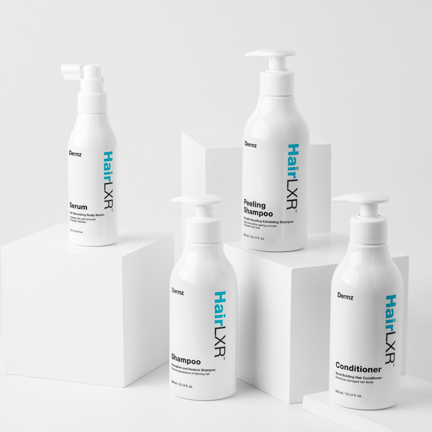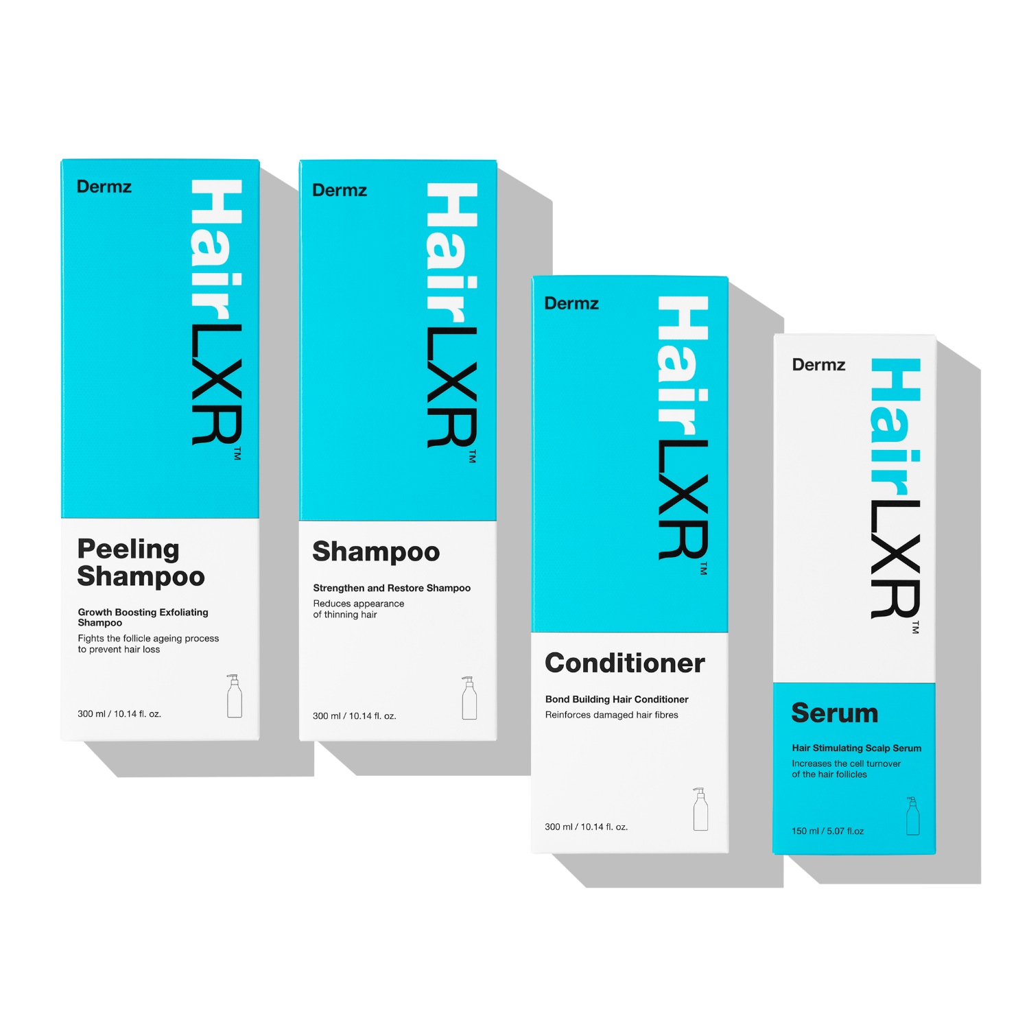 В состав набора входят: очищающий шампунь для волос HairLXR Peeling Shampoo, 300 мл + укрепляющий и восстанавливающий шампунь для волос HairLXR Shampoo, 300 мл + кондиционер для волос HairLXR Conditioner для поврежденных волос, 300 мл + сыворотка для кожи головы HairLXR Serum, 150 мл.