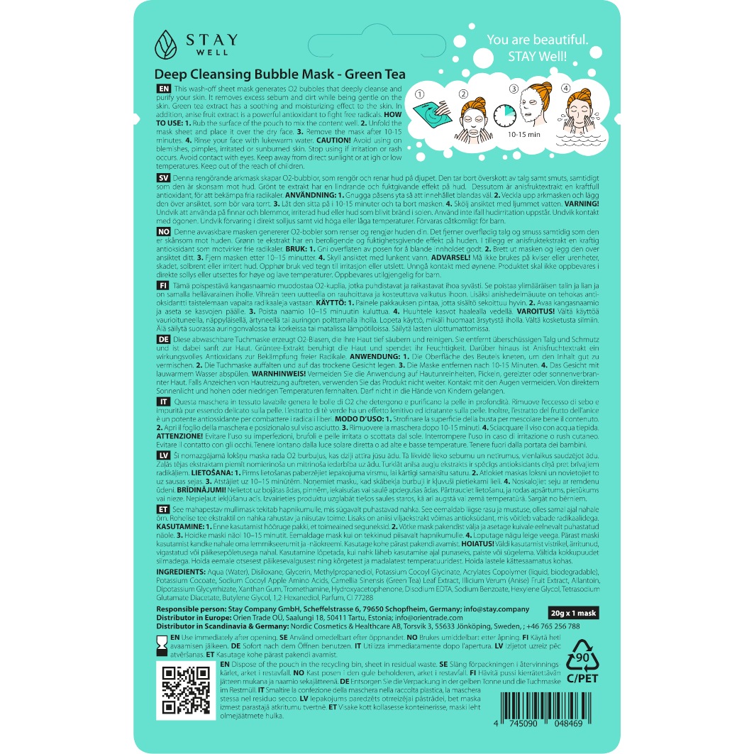 Эта смываемая тканевая маска создаёт кислородные пузырьки, которые глубоко очищают кожу. Маска мягко воздействует на кожу, удаляя излишки жира и загрязнения. Экстракт зелёного чая успокаивает и увлажняет кожу. Кроме того, экстракт плодов аниса является мощным антиоксидантом, борющимся со свободными радикалами.