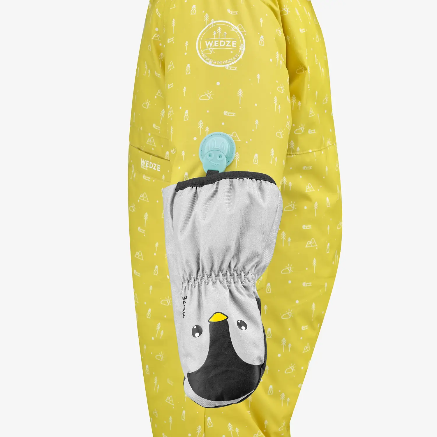 Как обеспечить тепло моему ребенку во время катания на санках в снегу? Наши разработчики используют утеплитель, чтобы он оставался в тепле. Размер волокон синтетического полиэстерового утеплителя определяет количество удерживаемого воздуха. Чем толще утеплитель, тем больше воздуха он удерживает и тем теплее он становится. Эти детские перчатки имеют плотность утеплителя 150 г/м². Как гарантировать, что мой ребенок не потеряет варежки, а его руки останутся теплыми и сухими? Используйте эту систему, чтобы прикрепить детские варежки к рукавам детского горнолыжного костюма, детского боди или куртки Decathlon. Этот забавный аксессуар поощряет самостоятельное исследование и помогает вашему ребенку прикрепить варежки к рукавам! Сочетайте цвета и головы животных, чтобы создавать уникальные формы. Варежки надежно держатся! Если у вас нет детского боди Decathlon, как вы можете предотвратить потерю варежек? Если у вас нет куртки или горнолыжного костюма, не волнуйтесь! Мы добавили эластичный шнур на внутреннюю сторону варежек, чтобы они плотно прилегали к рукам вашего ребенка.