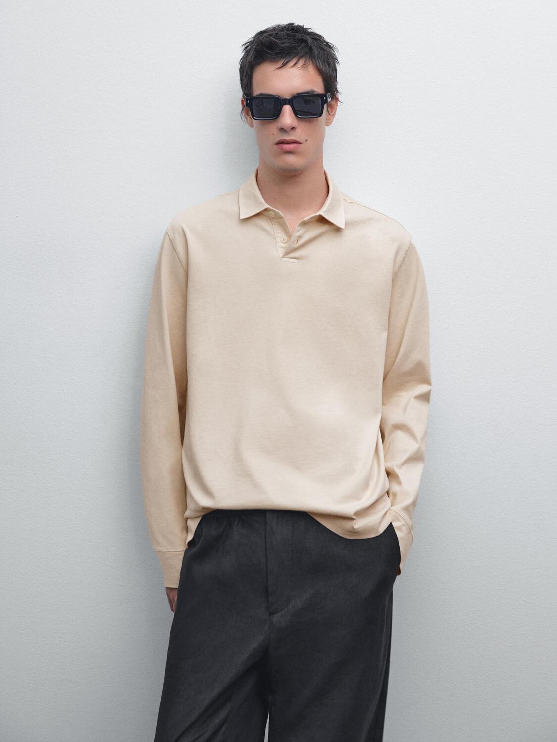 Рубашка-поло из 100% хлопка. Длинные рукава. Отложной воротник на пуговицах. Боковые разрезы по подолу. Ребристые края. Эффект потертости. Свободный и свободный силуэт, не приталенный.