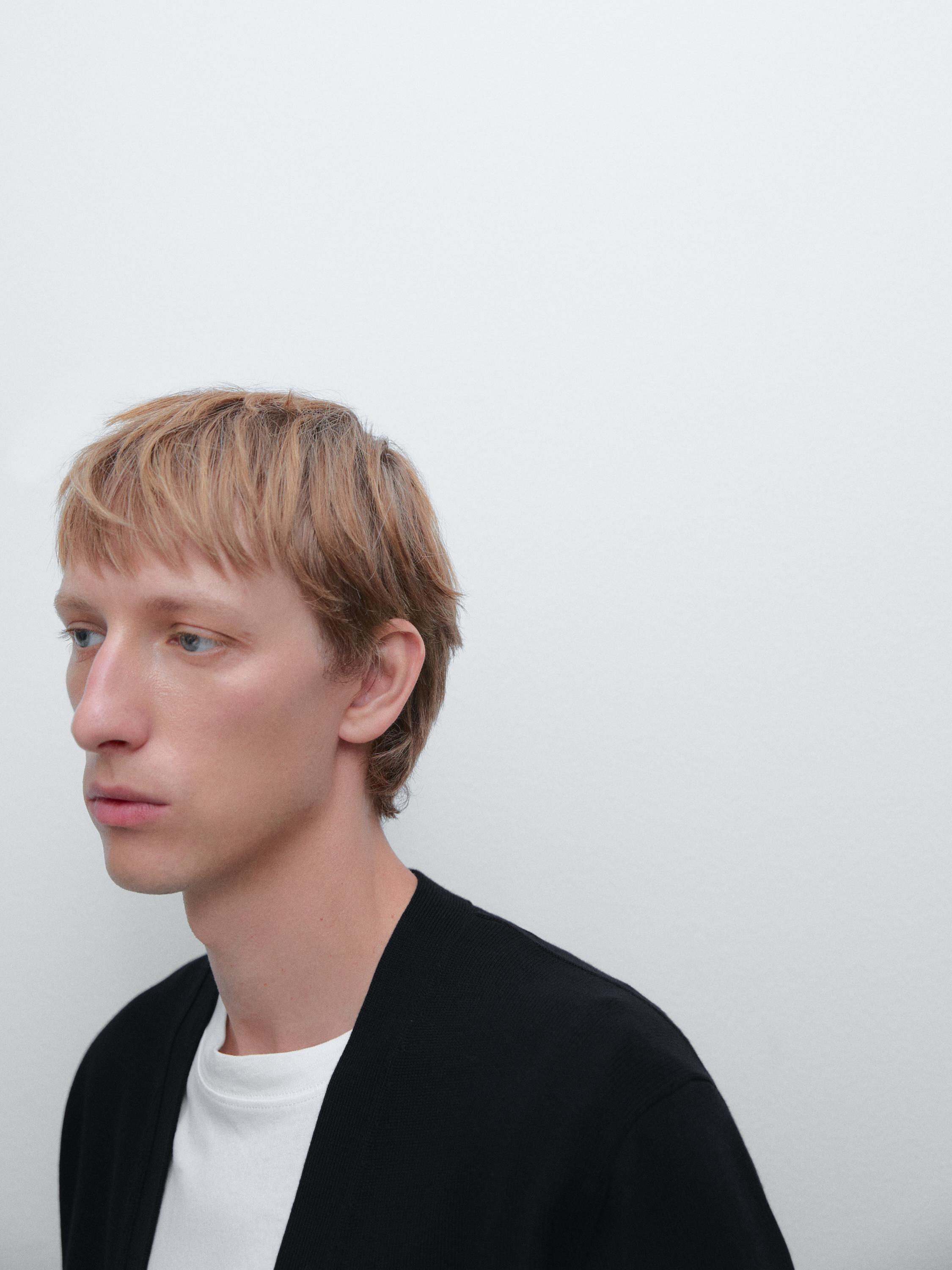 Кардиган из трикотажного полотна (100% хлопок). V-образный вырез. Длинные рукава. Застежка на пуговицы спереди. Ребристые края. Слегка свободный крой для большего комфорта.