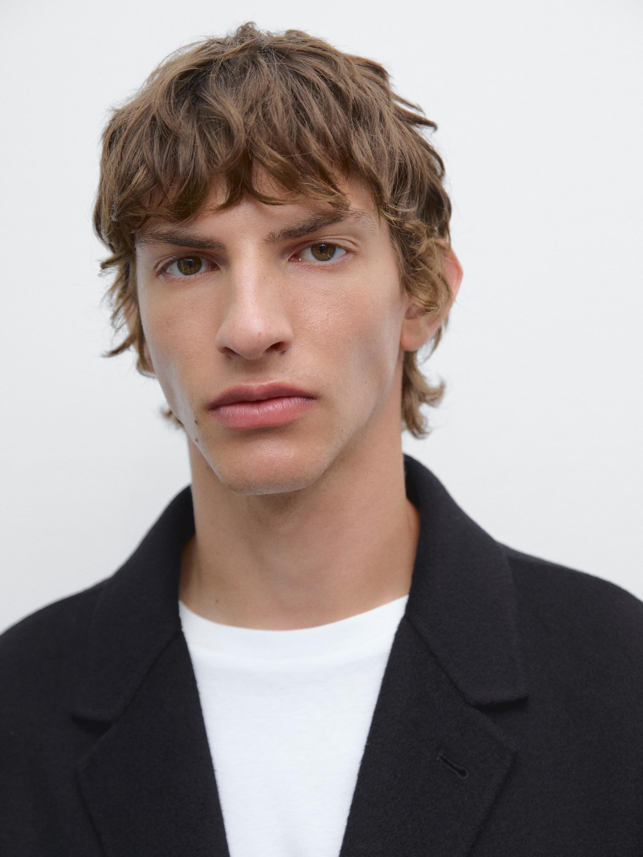 Пиджак из смесовой шерсти. Воротник с лацканами и петлей. Длинные рукава. Два накладных кармана. Детали швов.