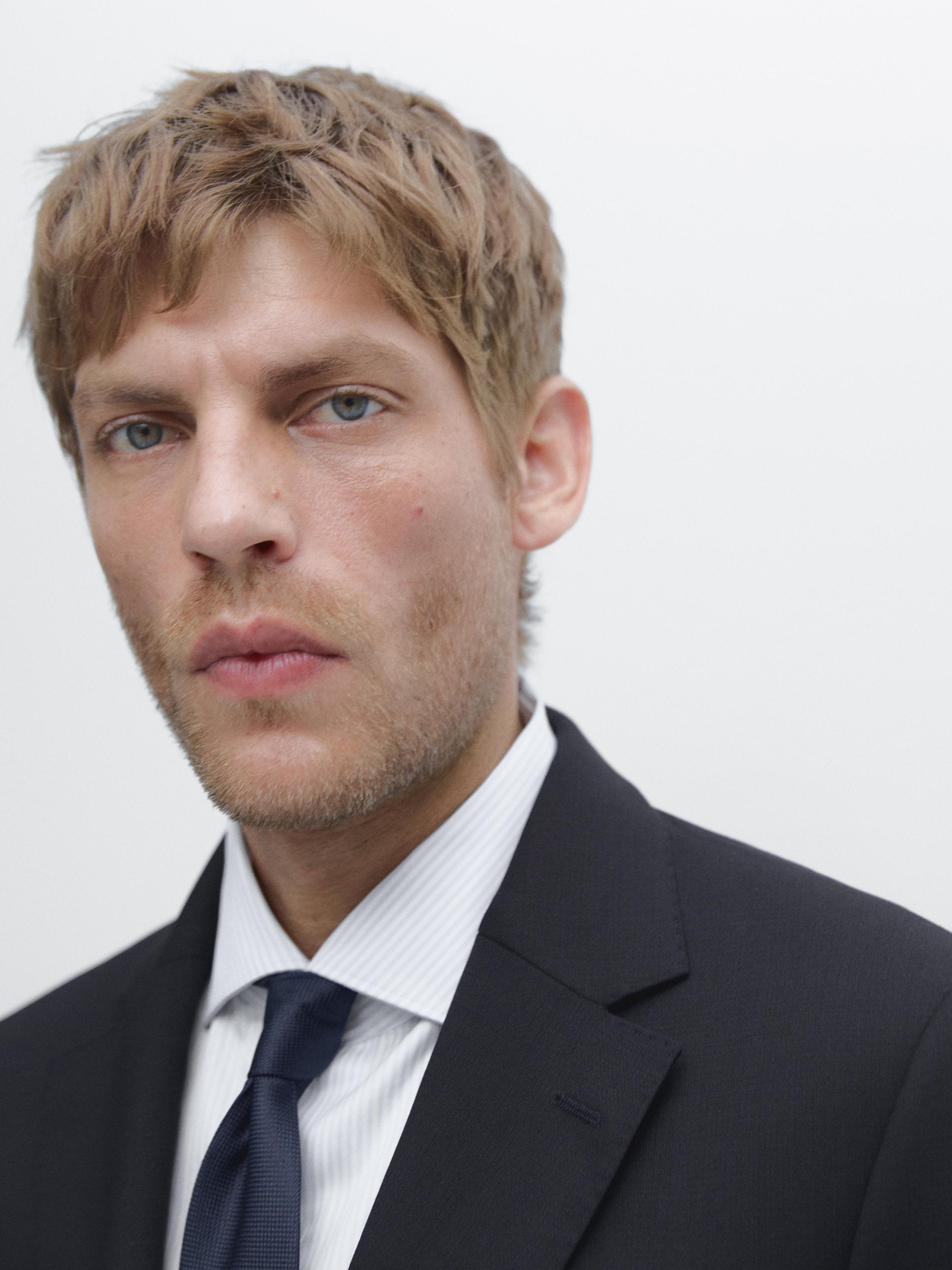 Пиджак из смесовой шерсти. Воротник с заостренными лацканами. Манжеты на пуговицах. Застежка на две пуговицы. Два кармана с клапанами. Нагрудный карман с меткой. Две шлицы сзади. Отделка отделкой. Этот предмет одежды является частью костюма.